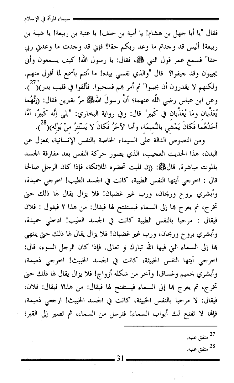 فقال "يا أبا جهل بن هشام! يا أمية بن خلف! يا عتبة بن ربيعة! يا شيبة بن ربيعة! أليس قد وجدتم ما وعد ربكم حقا؟ فإني قد وجدت ما وعدني ربي حقا" فسمع عمر قول النبي صلى الله عليه وسلم، فقال: يا رسول الله! كيف يسمعون وأنى يجيبون وقد جيفوا؟ قال "والذي نفسي بيده! ما أنتم بأسمع لما أقول منهم. ولكنهم لا يقدرون أن يجيبوا" ثم أمر بهم فسحبوا. فألقوا في قليب بدر) (¬1). وعن ابن عباس رضي الله عنهما؛ أنَّ رسولَ الله صلى الله عليه وسلم مرّ بقبرين فقال: (إنَّهُما يُعَذَّبانِ ومَا يُعَذَّبانِ في كَبير" قال: وفي رواية البخاري: "بلى إنَّه كَبيرٌ، أمَّا أحَدُهُما فَكانَ يَمْشِي بالنَّمِيمَةِ، وأما الآخَرُ فَكانَ لا يَسْتَتِرُ مِنْ بَوْلِه) (¬2).