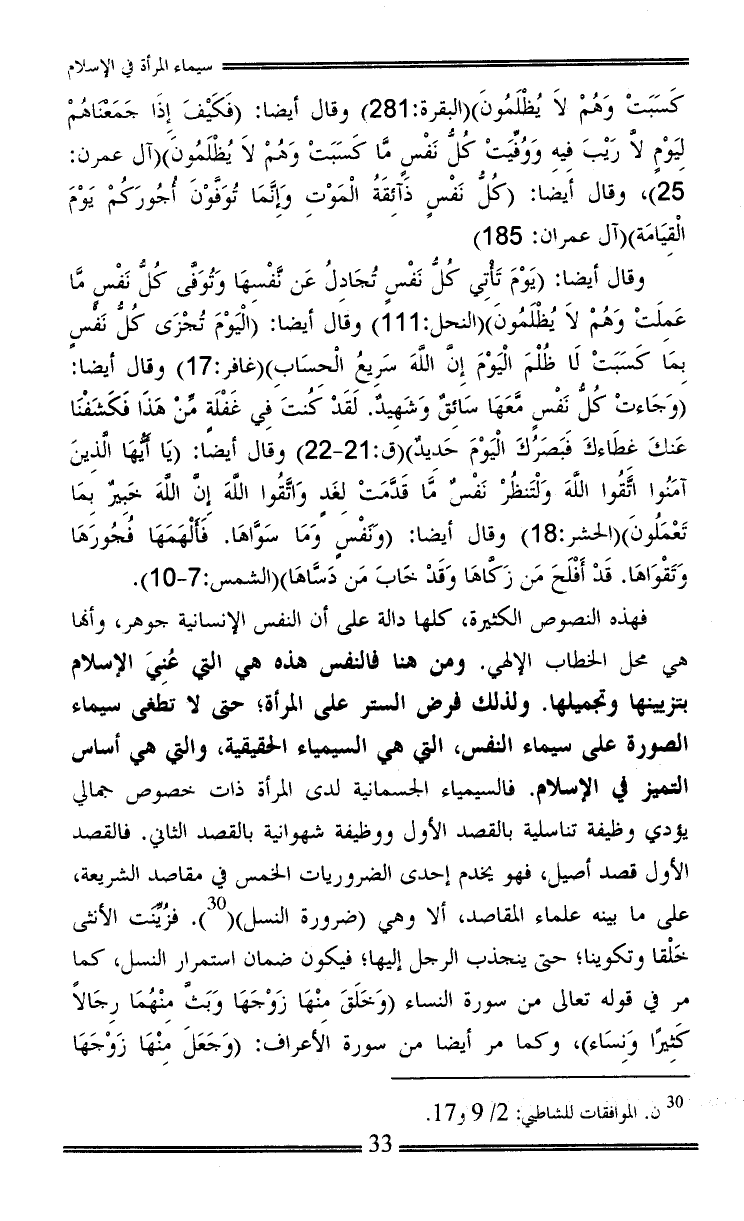 فهذه النصوص الكثيرة، كلها دالة على أن النفس الإنسانية جوهر، وأنها هي محل الخطاب الإلهي. ومن هنا فالنفس هذه هي التي عُنِيَ الإسلام بتزيينها وتجميلها. ولذلك فرض الستر على المرأة؛ حتى لا تطغى سيماء الصورة على سيماء النفس، التي هي السيمياء الحقيقية، والتي هي أساس التميز في الإسلام. فالسيمياء الجسمانية لدى المرأة ذات خصوص جمالي يؤدي وظيفة تناسلية بالقصد الأول ووظيفة شهوانية بالقصد الثاني. فالقصد الأول قصد أصيل، فهو يخدم إحدى الضروريات الخمس في مقاصد الشريعة، على ما بينه علماء المقاصد، ألا وهي (ضرورة النسل) (¬1). فزُيِّنَت الأنثى خَلْقا وتكوينا؛ حتى ينجذب الرجل إليها؛ فيكون ضمان استمرار النسل، كما مر في قوله تعالى من سورة النساء {وَخَلَقَ مِنْهَا زَوْجَهَا وَبَثَّ مِنْهُمَا رِجَالاً كَثِيرًا وَنِسَاء}، وكما مر أيضا من سورة الأعراف: {وَجَعَلَ مِنْهَا زَوْجَهَا