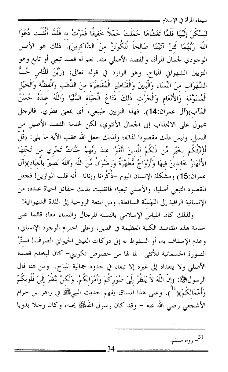 لِيَسْكُنَ إِلَيْهَا فَلَمَّا تَغَشَّاهَا حَمَلَتْ حَمْلاً خَفِيفًا فَمَرَّتْ بِهِ فَلَمَّا أَثْقَلَت دَّعَوَا اللهَ رَبَّهُمَا لَئِنْ آتَيْتَنَا صَالِحاً لَّنَكُونَنَّ مِنَ الشَّاكِرِينَ}. ذلك هو الأصل الوجودي لجمال المرأة، والقصد الأصلي منه. نعم له قصد تبعي أو تابع وهو التزيين الشهواني المباح. وهو الوارد في قوله تعالى: {زُيِّنَ لِلنَّاسِ حُبُّ الشَّهَوَاتِ مِنَ النِّسَاء وَالْبَنِينَ وَالْقَنَاطِيرِ الْمُقَنطَرَةِ مِنَ الذَّهَبِ وَالْفِضَّةِ وَالْخَيْلِ الْمُسَوَّمَةِ وَالأَنْعَامِ وَالْحَرْثِ ذَلِكَ مَتَاعُ الْحَيَاةِ الدُّنْيَا وَاللهُ عِندَهُ حُسْنُ الْمَآبِ} (آل عمران:14). فهذا التزيين طبيعي، أي بمعنى فطري. فالرجل مجبول على الانجذاب إلى الجمال الأنثوي، لكن لخدمة القصد الأصيل من النسل. وليس ذلك مقصودا لذاته؛ ولذلك جعل الله عقب الآية ما يلي: {قُلْ أَؤُنَبِّئُكُم بِخَيْرٍ مِّن ذَلِكُمْ لِلَّذِينَ اتَّقَوْا عِندَ رَبِّهِمْ جَنَّاتٌ تَجْرِي مِن تَحْتِهَا الأَنْهَارُ خَالِدِينَ فِيهَا وَأَزْوَاجٌ مُّطَهَّرَةٌ وَرِضْوَانٌ مِّنَ اللهِ وَاللهُ بَصِيرٌ بِالْعِبَادِ} (آل عمران:15) ومشكلة الإنسان اليوم -ذُكْرانا وإناثا- أنه قلب الموازين! فجعل المقصود التبعي أصليا، والأصلي تبعيا؛ فانقلبت بذلك حقائق الحياة عنده، من الإنسانية الراقية إلى البَهَمِيَّة الساقطة، ومن المتعة الروحية إلى اللذة الشهوانية!