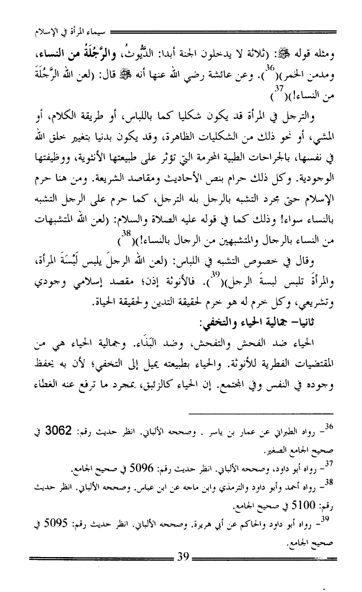 وقال في خصوص التشبه في اللباس: (لعن الله الرجلَ يلبس لَبْسَةَ المرأة، والمرأةَ تلبس لبسةَ الرجل) (¬4). فالأنوثة إذن؛ مقصد إسلامي وجودي وتشريعي، وكل خرم له هو خرم لحقيقة التدين ولحقيقة الحياة.