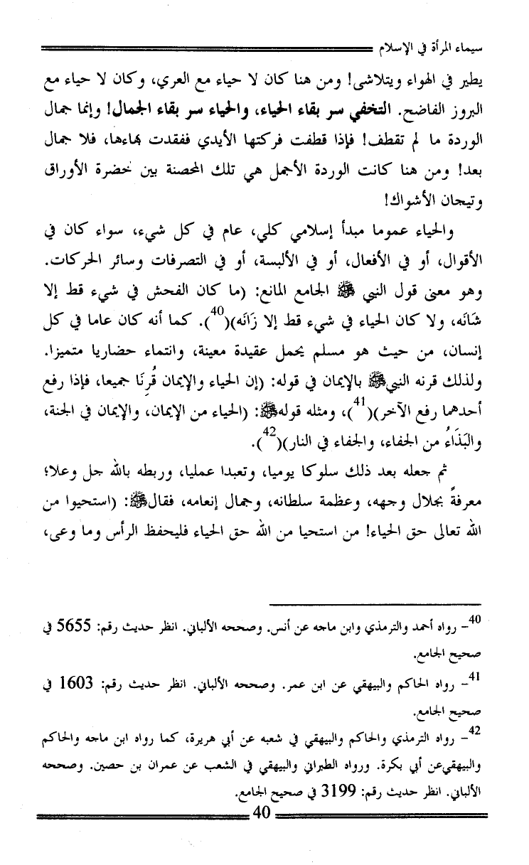 والحياء عموما مبدأ إسلامي كلي، عام في كل شيء، سواء كان في الأقوال، أو في الأفعال، أو في الألبسة، أو في التصرفات وسائر الحركات. وهو معنى قول النبي صلى الله عليه وسلم الجامع المانع: (ما كان الفحش في شيء قط إلا شَانَه، ولا كان الحياء في شيء قط إلا زَانَه) (¬1). كما أنه كان عاما في كل إنسان، من حيث هو مسلم يحمل عقيدة معينة، وانتماء حضاريا متميزا. ولذلك قرنه النبي صلى الله عليه وسلم بالإيمان في قوله: (إن الحياء والإيمان قُرِنَا جميعا، فإذا رفع أحدهما رفع الآخر) (¬2)، ومثله قوله صلى الله عليه وسلم: (الحياء من الإيمان، والإيمان في الجنة، والبَذَاءُ من الجفاء، والجفاء في النار) (¬3).