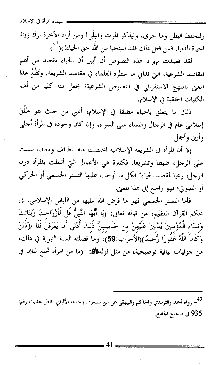 ذلك ما يتعلق بالحياء مطلقا في الإسلام، أعني من حيث هو خُلُقٌ إسلامي عام في الرجال والنساء على السواء، وإن كان وجوده في المرأة أجلى وأبين وأجمل.