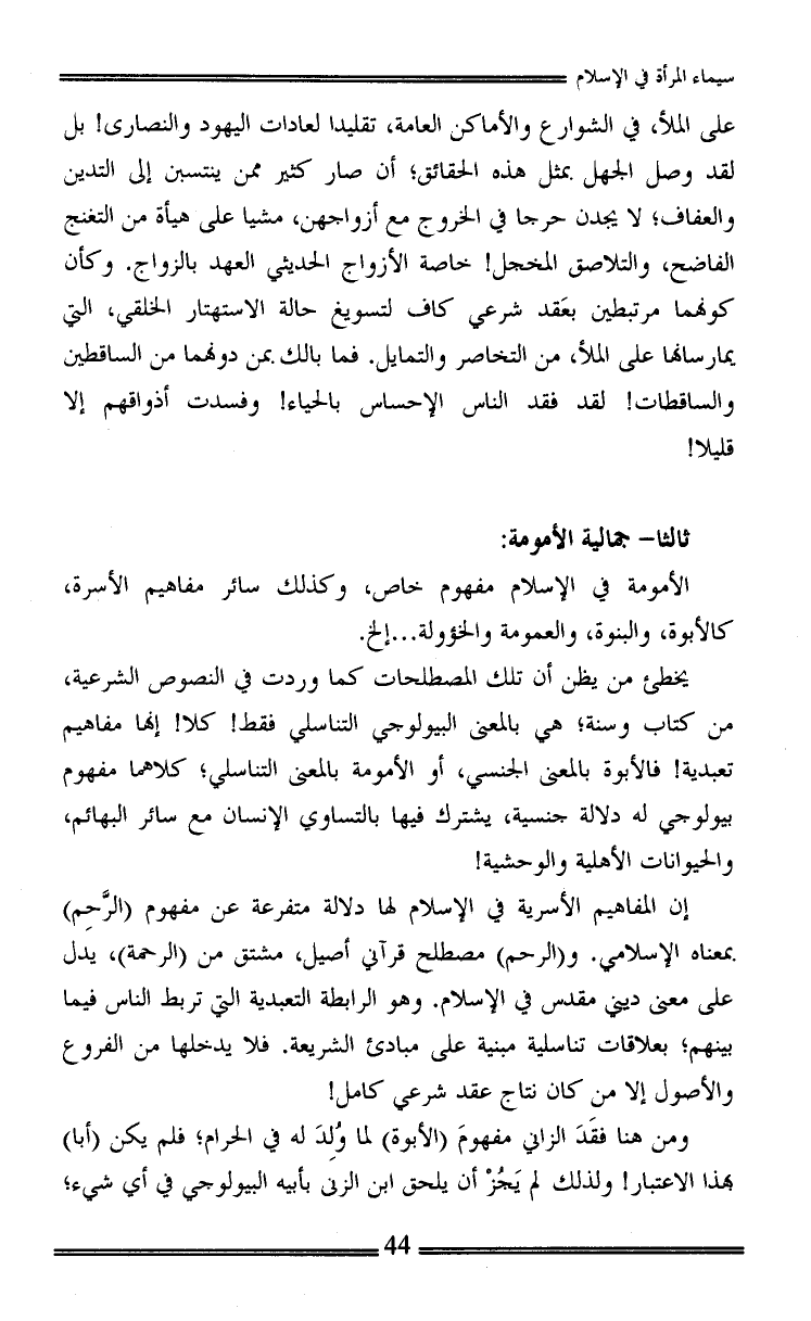 يخطئ من يظن أن تلك المصطلحات كما وردت في النصوص الشرعية، من كتاب وسنة؛ هي بالمعنى البيولوجي التناسلي فقط! كلا! إنها مفاهيم تعبدية! فالأبوة بالمعنى الجنسي، أو الأمومة بالمعنى التناسلي؛ كلاهما مفهوم بيولوجي له دلالة جنسية، يشترك فيها بالتساوي الإنسان مع سائر البهائم، والحيوانات الأهلية والوحشية!