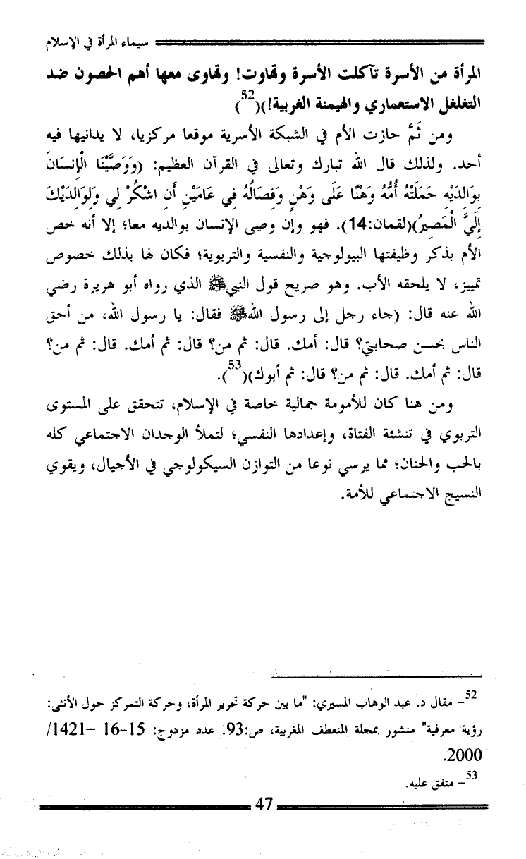 (¬1) مقال د. عبد الوهاب المسيري: "ما بين حركة تحرير المرأة، وحركة التمركز حول الأنثى: رؤية معرفية" منشور بمجلة المنعطف المغربية، ص:93. عدد مزدوج: 15 - 16 - 1421/ 2000.