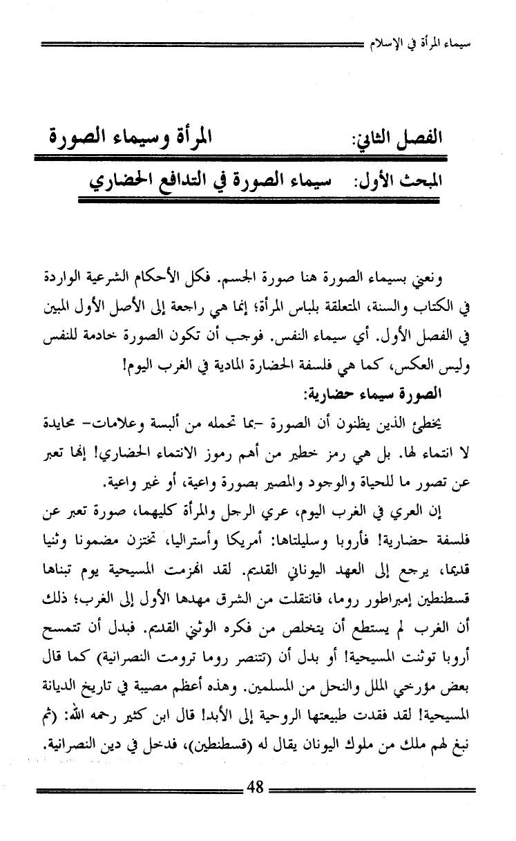 ونعني بسيماء الصورة هنا صورة الجسم. فكل الأحكام الشرعية الواردة في الكتاب والسنة، المتعلقة بلباس المرأة؛ إنما هي راجعة إلى الأصل الأول المبين في الفصل الأول. أي سيماء النفس. فوجب أن تكون الصورة خادمة للنفس وليس العكس، كما هي فلسفة الحضارة المادية في الغرب اليوم!
