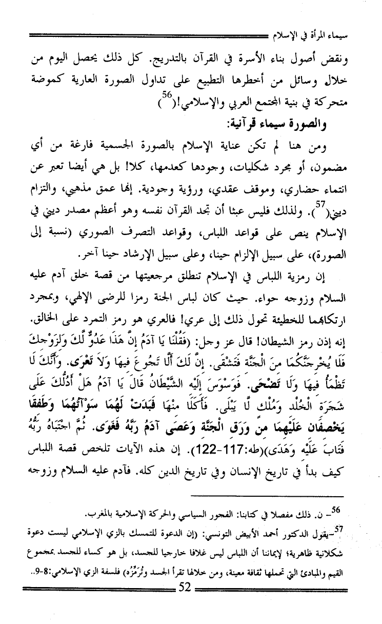 (¬2) يقول الدكتور أحمد الأبيض التونسي: (إن الدعوة للتمسك بالزي الإسلامي ليست دعوة شكلانية ظاهرية؛ لإيماننا أن اللباس ليس غلافا خارجيا للجسد، بل هو كساء للجسد بمجموع القيم والمبادئ التي تحملها ثقافة معينة، ومن خلالها تقرأ الجسد وتُرَمِّزُه) فلسفة الزي الإسلامي: 8 - 9.