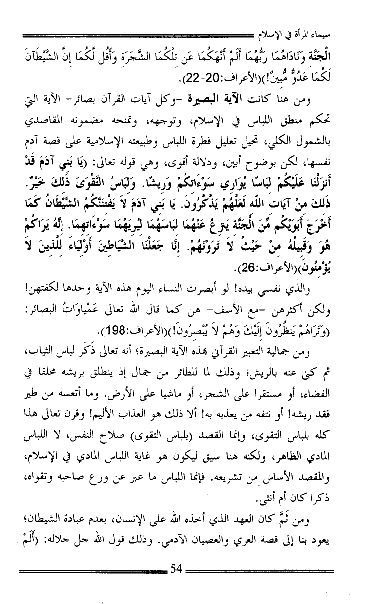 ومن هنا كانت الآية البصيرة -وكل آيات القرآن بصائر- الآية التي تحكم منطق اللباس في الإسلام، وتوجهه، وتمنحه مضمونه المقاصدي بالشمول الكلي، تحيل تعليل فطرة اللباس وطبيعته الإسلامية على قصة آدم نفسها، لكن بوضوح أبين، ودلالة أقوى، وهي قوله تعالى: {يَا بَنِي آدَمَ قَدْ أَنزَلْنَا عَلَيْكُمْ لِبَاسًا يُوَارِي سَوْءَاتِكُمْ وَرِيشًا. وَلِبَاسُ التَّقْوَىَ ذَلِكَ خَيْرٌ. ذَلِكَ مِنْ آيَاتِ اللهِ لَعَلَّهُمْ يَذَّكَّرُونَ. يَا بَنِي آدَمَ لاَ يَفْتِنَنَّكُمُ الشَّيْطَانُ كَمَا أَخْرَجَ أَبَوَيْكُم مِّنَ الْجَنَّةِ يَنزِعُ عَنْهُمَا لِبَاسَهُمَا لِيُرِيَهُمَا سَوْءَاتِهِمَا. إِنَّهُ يَرَاكُمْ هُوَ وَقَبِيلُهُ مِنْ حَيْثُ لاَ تَرَوْنَهُمْ. إِنَّا جَعَلْنَا الشَّيَاطِينَ أَوْلِيَاءَ لِلَّذِينَ لاَ يُؤْمِنُونَ} (الأعراف:26).