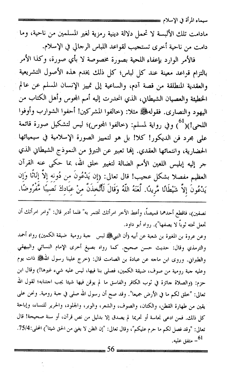 فالأمر الوارد بإعفاء اللحية بصورة مخصوصة لا بأي صورة، وكذا الأمر بالتزام قواعد معينة عند كل لباس؛ كل ذلك يخدم هذه الأصول التشريعية والعقدية المنطلقة من قصة آدم، والساعية إلى تمييز الإنسان المسلم عن عالم الخطيئة والعصيان الشيطاني، الذي انحدرت إليه أمم المجوس وأهل الكتاب من اليهود والنصارى. فقوله صلى الله عليه وسلم مثلا: (خالفوا المشركين! أحفوا الشوارب وأوفوا اللحى!) (¬1) وفي رواية لمسلم: (خالفوا المجوس)؛ ليس لتشكيل صورة قائمة على مجرد فن الديكور! كلا! بل هو لتمييز الصورة الإسلامية في سيميائها الحضارية، وانتمائها العقدي. إنها تعبير عن التبرؤ من النموذج الشيطاني الذي جر إليه إبليس اللعين الأمم الضالة لتغيير خلق الله، بما حكى عنه القرآن العظيم مفصلا بشكل عجيب! قال تعالى: {إِن يَدْعُونَ مِن دُونِهِ إِلاَّ إِنَاثًا وَإِن يَدْعُونَ إِلاَّ شَيْطَانًا مَّرِيدًا. لَّعَنَهُ اللهُ وَقَالَ لَأَتَّخِذَنَّ مِنْ عِبَادِكَ نَصِيبًا مَّفْرُوضًا.