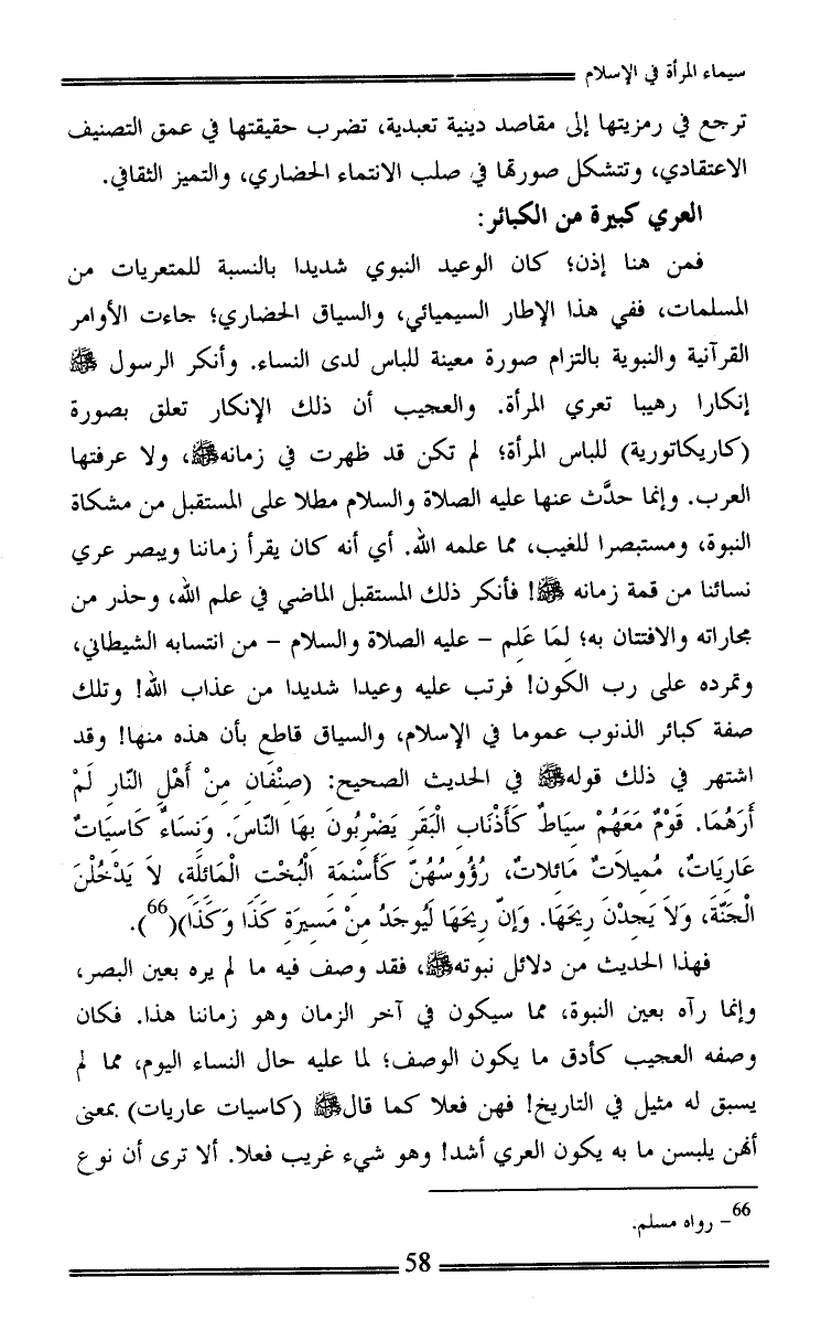 فمن هنا إذن؛ كان الوعيد النبوي شديدا بالنسبة للمتعريات من المسلمات، ففي هذا الإطار السيميائي، والسياق الحضاري؛ جاءت الأوامر القرآنية والنبوية بالتزام صورة معينة للباس لدى النساء. وأنكر الرسول صلى الله عليه وسلم إنكارا رهيبا تعري المرأة. والعجيب أن ذلك الإنكار تعلق بصورة (كاريكاتورية) للباس المرأة؛ لم تكن قد ظهرت في زمانه صلى الله عليه وسلم، ولا عرفتها العرب. وإنما حدَّث عنها عليه الصلاة والسلام مطلا على المستقبل من مشكاة النبوة، ومستبصرا للغيب، مما علمه الله. أي أنه كان يقرأ زماننا ويبصر عري نسائنا من قمة زمانه صلى الله عليه وسلم! فأنكر ذلك المستقبل الماضي في علم الله، وحذر من مجاراته والافتتان به؛ لِمَا عَلِم -عليه الصلاة والسلام- من انتسابه الشيطاني، وتمرده على رب الكون! فرتب عليه وعيدا شديدا من عذاب الله! وتلك صفة كبائر الذنوب عموما في الإسلام، والسياق قاطع بأن هذه منها! وقد اشتهر في ذلك قوله صلى الله عليه وسلم في الحديث الصحيح: (صِنْفَانِ مِنْ أَهْلِ النّارِ لَمْ أَرَهُمَا. قَوْمٌ مَعَهُمْ سِيَاطٌ كَأَذْنَابِ الْبَقَرِ يَضْرِبُونَ بِهَا النّاسَ. وَنِسَاءٌ كَاسِيَاتٌ عَارِيَاتٌ، مُمِيلاَتٌ مَائِلاتٌ، رُؤُوسُهُنّ كَأَسْنِمَةِ الْبُخْتِ الْمَائِلَةِ، لاَ يَدْخُلْنَ الْجَنّةَ، وَلاَ يَجِدْنَ رِيحَهَا. وَإنّ رِيحَهَا لَيُوجَدُ مِنْ مَسِيرَةِ كَذَا وَكَذَا) (¬1).