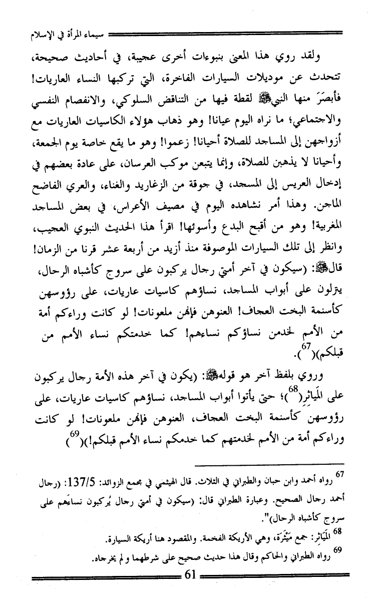 ولقد روي هذا المعنى بنبوءات أخرى عجيبة، في أحاديث صحيحة، تتحدث عن موديلات السيارات الفاخرة، التي تركبها النساء العاريات! فأبصَرَ منها النبي صلى الله عليه وسلم لقطة فيها من التناقض السلوكي، والانفصام النفسي والاجتماعي؛ ما نراه اليوم عيانا! وهو ذهاب هؤلاء الكاسيات العاريات مع أزواجهن إلى المساجد للصلاة أحيانا! زعموا! وهو ما يقع خاصة يوم الجمعة، وأحيانا لا يذهبن للصلاة، وإنما يتبعن موكب العرسان، على عادة بعضهم في إدخال العريس إلى المسجد، في جوقة من الزغاريد والغناء، والعري الفاضح الماجن. وهذا أمر نشاهده اليوم في مصيف الأعراس، في بعض المساجد المغربية! وهو من أقبح البدع وأسوئها! اقرأ هذا الحديث النبوي العجيب، وانظر إلى تلك السيارات الموصوفة منذ أزيد من أربعة عشر قرنا من الزمان! قال صلى الله عليه وسلم: (سيكون في آخر أمتي رجال يركبون على سروج كأشباه الرحال، ينزلون على أبواب المساجد، نساؤهم كاسيات عاريات، على رؤوسهن كأسنمة البخت العجاف! العنوهن فإنهن ملعونات! لو كانت وراءكم أمة من الأمم لخدمن نساؤكم نساءهم! كما خدمتكم نساء الأمم من قبلكم) (¬1).