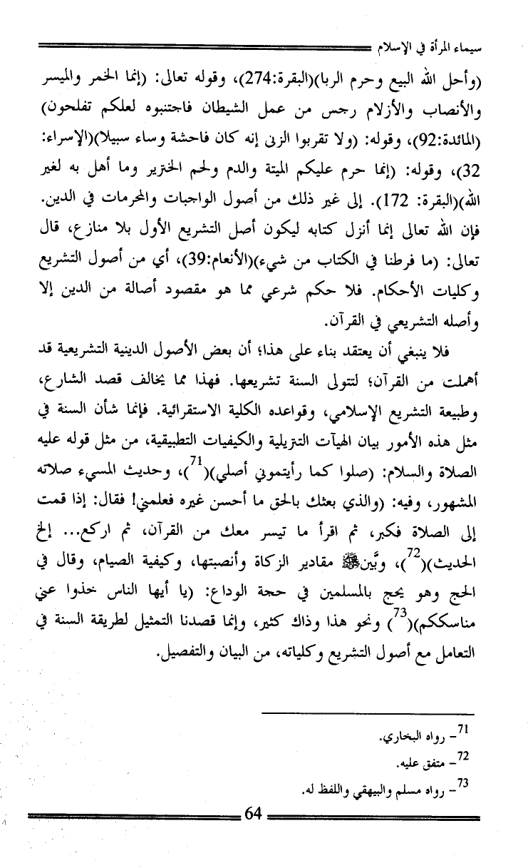 فلا ينبغي أن يعتقد بناء على هذا؛ أن بعض الأصول الدينية التشريعية قد أهملت من القرآن؛ لتتولى السنة تشريعها. فهذا مما يخالف قصد الشارع، وطبيعة التشريع الإسلامي، وقواعده الكلية الاستقرائية. فإنما شأن السنة في مثل هذه الأمور بيان الهيآت التنزيلية والكيفيات التطبيقية، من مثل قوله عليه الصلاة والسلام: (صلوا كما رأيتموني أصلي) (¬1)، وحديث المسيء صلاته المشهور، وفيه: (والذي بعثك بالحق ما أحسن غيره فعلمني! فقال: إذا قمت إلى الصلاة فكبر، ثم اقرأ ما تيسر معك من القرآن، ثم اركع ... إلخ الحديث) (¬2)، وبَّين صلى الله عليه وسلم مقادير الزكاة وأنصبتها، وكيفية الصيام، وقال في الحج وهو يحج بالمسلمين في حجة الوداع: (يا أيها الناس خذوا عني مناسككم) (¬3) ونحو هذا وذاك كثير، وإنما قصدنا التمثيل لطريقة السنة في التعامل مع أصول التشريع وكلياته، من البيان والتفصيل.