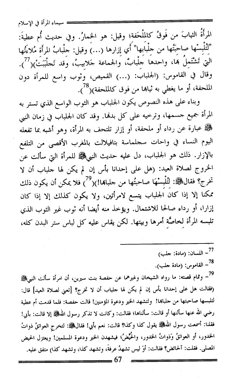 وبناء على هذه النصوص يكون الجلباب هو الثوب الواسع الذي تستر به المرأة جميع جسمها، وترخيه على كل بدنها. وقد كان الجلباب في زمان النبي صلى الله عليه وسلم عبارة عن رداء أو ملحفة، أو إزار تلتحف به المرأة، وهو أشبه بما تفعله اليوم النساء في واحات سجلماسة بتافيلالت بالمغرب الأقصى من التلفع بالإزار. ذلك هو الجلباب، دل عليه حديث النبي صلى الله عليه وسلم للمرأة التي سألت عن الخروج لصلاة العيد: (هل على إحدانا بأس إن لم يكن لها جلباب أن لا تخرج؟ فقال صلى الله عليه وسلم: لِتُلْبِسْهَا صاحبتُها من جلبابها!) (¬3) فلا يمكن أن يكون ذلك ممكنا إلا إذا كان الجلباب يتسع لامرأتين، ولا يكون كذلك إلا إذا كان إزارا، أو رداء صالحا للاشتمال. ويؤخذ منه أيضا أنه ثوب غير الثوب الذي تلبسه المرأة لِخاصَّةِ أمرها وبيتها. لكن يقاس عليه كل لباس ستر البدن كله،