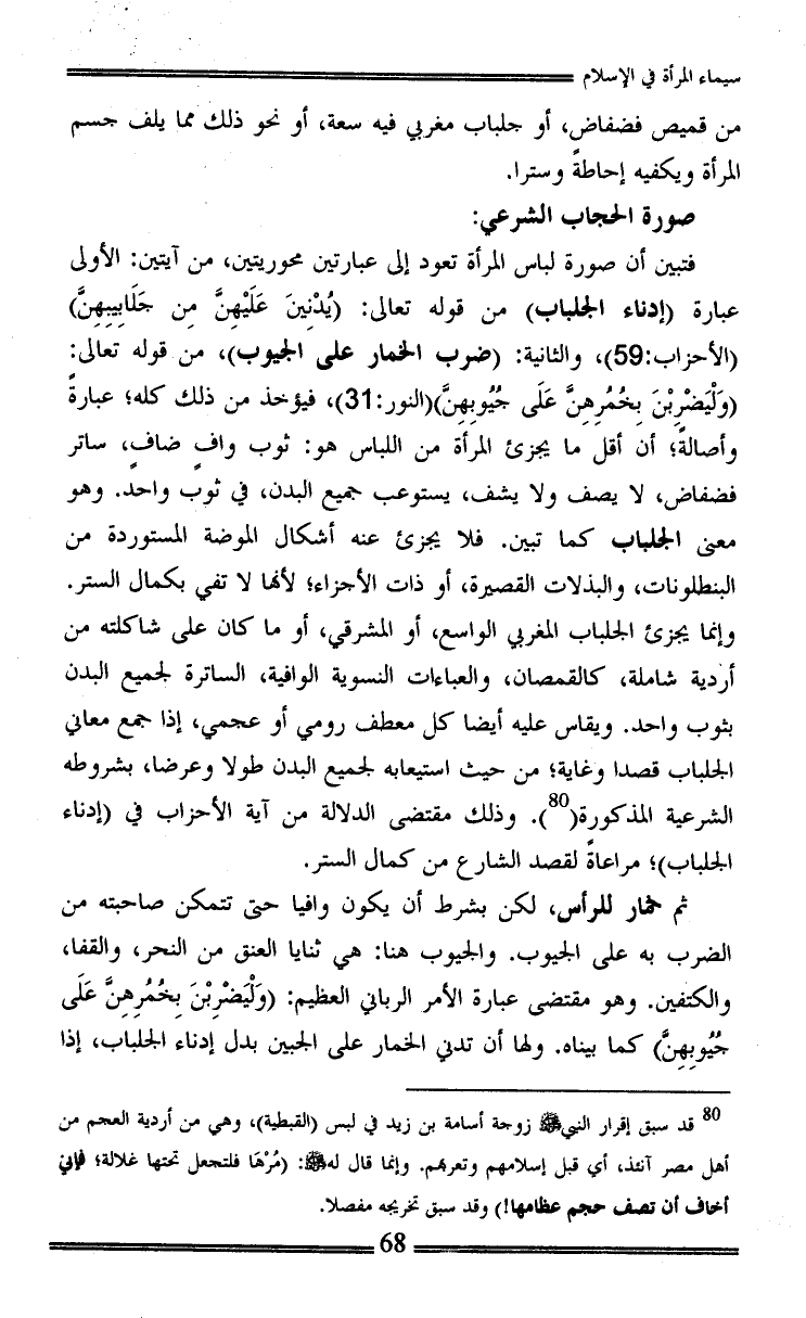فتبين أن صورة لباس المرأة تعود إلى عبارتين محوريتين، من آيتين: الأولى عبارة (إدناء الجلباب) من قوله تعالى: {يُدْنِينَ عَلَيْهِنَّ مِن جَلَابِيبِهِنَّ} (الأحزاب:59)، والثانية: (ضرب الخمار على الجيوب)، من قوله تعالى: {وَلْيَضْرِبْنَ بِخُمُرِهِنَّ عَلَى جُيُوبِهِنَّ} (النور:31)، فيؤخذ من ذلك كله؛ عبارةً وأصالةً؛ أن أقل ما يجزئ المرأة من اللباس هو: ثوب وافٍ ضافٍ، ساتر فضفاض، لا يصف ولا يشف، يستوعب جميع البدن، في ثوب واحد. وهو معنى الجلباب كما تبين. فلا يجزئ عنه أشكال الموضة المستوردة من البنطلونات، والبذلات القصيرة، أو ذات الأجزاء؛ لأنها لا تفي بكمال الستر. وإنما يجزئ الجلباب المغربي الواسع، أو المشرقي، أو ما كان على شاكلته من أردية شاملة، كالقمصان، والعباءات النسوية الوافية، الساترة لجميع البدن بثوب واحد. ويقاس عليه أيضا كل معطف رومي أو عجمي، إذا جمع معاني الجلباب قصدا وغاية؛ من حيث استيعابه لجميع البدن طولا وعرضا، بشروطه الشرعية المذكورة (¬1). وذلك مقتضى الدلالة من آية الأحزاب في (إدناء الجلباب)؛ مراعاةً لقصد الشارع من كمال الستر.