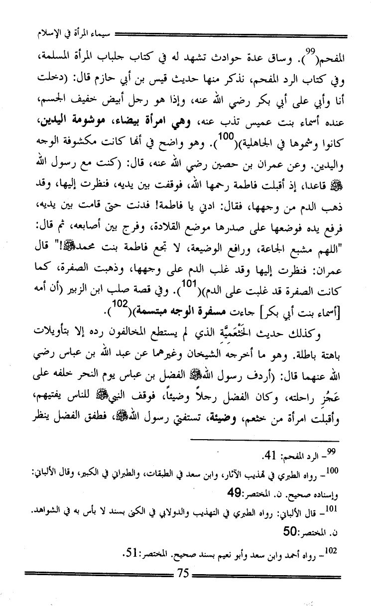 المفحم (¬1). وساق عدة حوادث تشهد له في كتاب جلباب المرأة المسلمة، وفي كتاب الرد المفحم، نذكر منها حديث قيس بن أبي حازم قال: (دخلت أنا وأبي على أبي بكر رضي الله عنه، وإذا هو رجل أبيض خفيف الجسم، عنده أسماء بنت عميس تذب عنه، وهي امرأة بيضاء، موشومة اليدين، كانوا وشموها في الجاهلية) (¬2). وهو واضح في أنها كانت مكشوفة الوجه واليدين. وعن عمران بن حصين رضي الله عنه، قال: (كنت مع رسول الله صلى الله عليه وسلم قاعدا، إذ أقبلت فاطمة رحمها الله، فوقفت بين يديه، فنظرت إليها، وقد ذهب الدم من وجهها، فقال: ادني يا فاطمة! فدنت حتى قامت بين يديه، فرفع يده فوضعها على صدرها موضع القلادة، وفرج بين أصابعه، ثم قال: "اللهم مشبع الجاعة، ورافع الوضيعة، لا تجع فاطمة بنت محمد صلى الله عليه وسلم! " قال عمران: فنظرت إليها وقد غلب الدم على وجهها، وذهبت الصفرة، كما كانت الصفرة قد غلبت على الدم) (¬3). وفي قصة صلب ابن الزبير (أن أمه [أسماء بنت أبي بكر] جاءت مسفرة الوجه مبتسمة) (¬4)