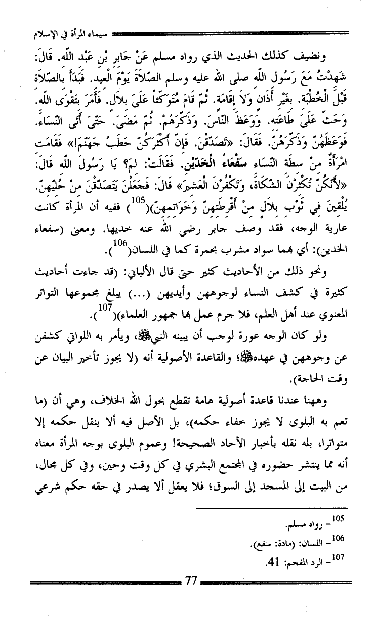 ونضيف كذلك الحديث الذي رواه مسلم عَنْ جَابِرِ بْنِ عَبْدِ اللهِ. قَالَ: شَهِدْتُ مَعَ رَسُولِ اللهِ صلى الله عليه وسلم الصّلاَةَ يَوْمَ الْعِيدِ. فَبَدَأَ بِالصّلاَةِ قَبْلَ الْخُطْبَةِ. بِغَيْرِ أَذَانٍ وَلاَ إِقَامَةٍ. ثُمّ قَامَ مُتَوَكّئاً عَلَىَ بِلاَلٍ. فَأَمَرَ بِتَقْوَى اللهِ. وَحَثّ عَلَىَ طَاعَتِهِ. وَوَعَظَ النّاسَ. وَذَكّرَهُمْ. ثُمّ مَضَىَ. حَتّىَ أَتَى النّسَاءَ. فَوَعَظَهُنّ وَذَكّرَهُنّ. فَقَالَ: «تَصَدّقْنَ. فَإِنّ أَكْثَرَكُنّ حَطَبُ جَهَنّمَ!» فَقَامَتِ امْرَأَةٌ مِنْ سِطَةِ النّسَاءِ سَفْعَاءُ الْخَدّيْنِ. فَقَالَتْ: لِمَ؟ يَا رَسُولَ اللهِ قَالَ: «لأَنّكُنّ تُكْثِرْنَ الشّكَاةَ، وَتَكْفُرْنَ الْعَشِيرَ» قَالَ: فَجَعَلْنَ يَتَصَدّقْنَ مِنْ حُلِيّهِنّ. يُلْقِينَ فِي ثَوْبِ بِلاَلٍ مِنْ أَقْرِطَتِهِنّ وَخَوَاتِمِهِنّ) (¬1) ففيه أن المرأة كانت عارية الوجه، فقد وصف جابر رضي الله عنه خديها. ومعنى (سفعاء الخدين): أي بهما سواد مشرب بحمرة كما في اللسان (¬2).