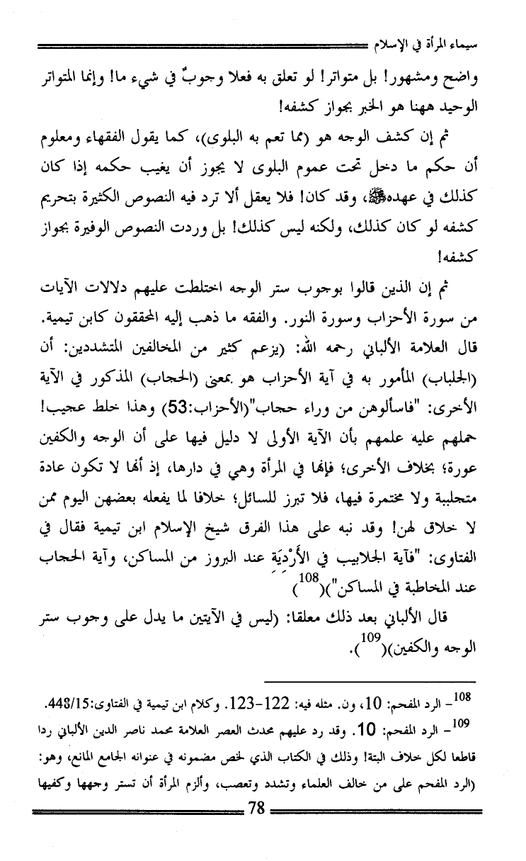 (¬2) الرد المفحم: 10. وقد رد عليهم محدث العصر العلامة محمد ناصر الدين الألباني ردا قاطعا لكل خلاف البتة! وذلك في الكتاب الذي لخص مضمونه في عنوانه الجامع المانع، وهو: (الرد المفحم على من خالف العلماء وتشدد وتعصب، وألزم المرأة أن تستر وجهها وكفيها =