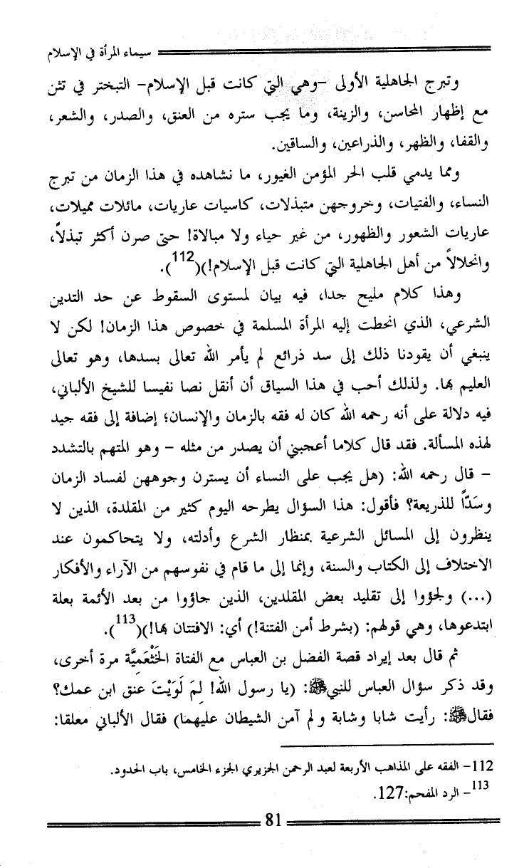 وهذا كلام مليح جدا، فيه بيان لمستوى السقوط عن حد التدين الشرعي، الذي انحطت إليه المرأة المسلمة في خصوص هذا الزمان! لكن لا ينبغي أن يقودنا ذلك إلى سد ذرائع لم يأمر الله تعالى بسدها، وهو تعالى العليم بها. ولذلك أحب في هذا السياق أن أنقل نصا نفيسا للشيخ الألباني، فيه دلالة على أنه رحمه الله كان له فقه بالزمان والإنسان؛ إضافة إلى فقه جيد لهذه المسألة. فقد قال كلاما أعجبني أن يصدر من مثله -وهو المتهم بالتشدد- قال رحمه الله: (هل يجب على النساء أن يسترن وجوههن لفساد الزمان وسَدّاً للذريعة؟ فأقول: هذا السؤال يطرحه اليوم كثير من المقلدة، الذين لا ينظرون إلى المسائل الشرعية بمنظار الشرع وأدلته، ولا يتحاكمون عند الاختلاف إلى الكتاب والسنة، وإنما إلى ما قام في نفوسهم من الآراء والأفكار (...) ولجؤوا إلى تقليد بعض المقلدين، الذين جاؤوا من بعد الأئمة بعلة ابتدعوها، وهي قولهم: (بشرط أمن الفتنة!) أي: الافتتان بها!) (¬2).