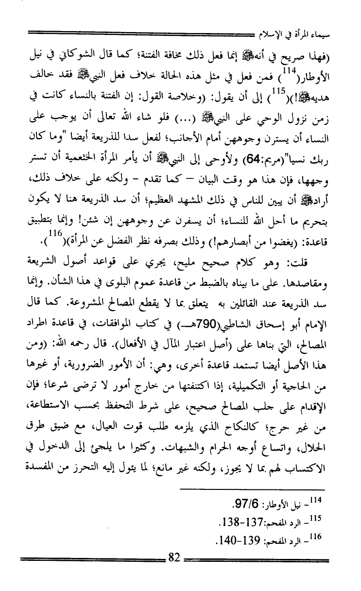 (فهذا صريح في أنه صلى الله عليه وسلم إنما فعل ذلك مخافة الفتنة؛ كما قال الشوكاني في نيل الأوطار (¬1) فمن فعل في مثل هذه الحالة خلاف فعل النبي صلى الله عليه وسلم فقد خالف هديه صلى الله عليه وسلم!) (¬2) إلى أن يقول: (وخلاصة القول: إن الفتنة بالنساء كانت في زمن نزول الوحي على النبي صلى الله عليه وسلم (...) فلو شاء الله تعالى أن يوجب على النساء أن يسترن وجوههن أمام الأجانب؛ لفعل سدا للذريعة أيضا {وما كان ربك نسيا} (مريم:64) ولأوحى إلى النبي صلى الله عليه وسلم أن يأمر المرأة الخثعمية أن تستر وجهها، فإن هذا هو وقت البيان -كما تقدم- ولكنه على خلاف ذلك، أراد صلى الله عليه وسلم أن يبين للناس في ذلك المشهد العظيم؛ أن سد الذريعة هنا لا يكون بتحريم ما أحل الله للنساء؛ أن يسفرن عن وجوههن إن شئن! وإنما بتطبيق قاعدة: (يغضوا من أبصارهم!) وذلك بصرفه نظر الفضل عن المرأة) (¬3).