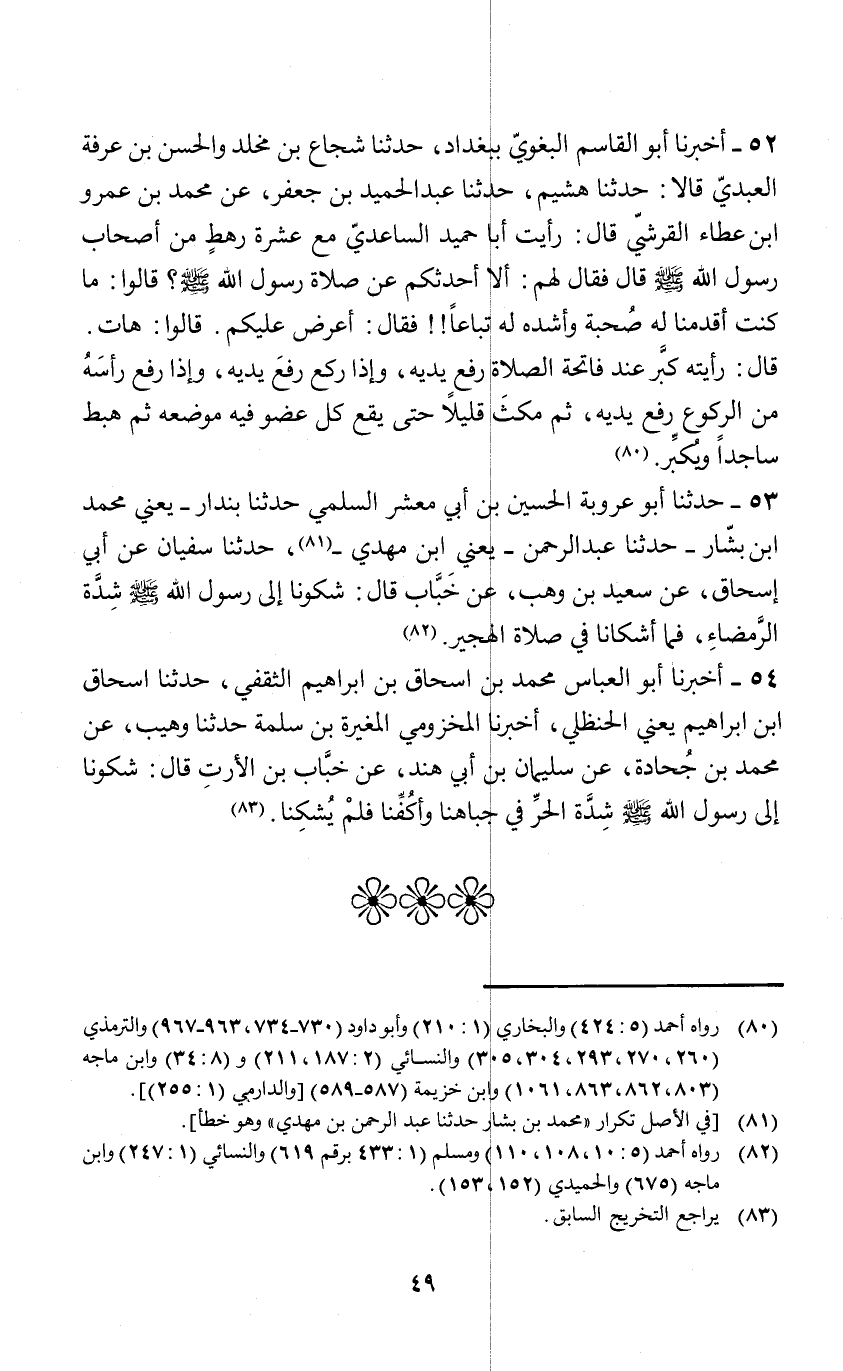 53 - حَدَّثَنَا أَبُو عَرُوبَةَ الْحُسَيْنُ بْنُ أَبِي مَعْشَرٍ السُّلَمِيُّ، نَا بُنْدَارٌ يَعْنِي مُحَمَّدَ بْنَ بَشَّارٍ، نَا عَبْدُ الرَّحْمَنِ يَعْنِي ابْنَ مَهْدِيِّ، نَا سُفْيَانُ، عَنْ أَبِي إِسْحَاقَ، عَنْ سَعِيدِ بْنِ وَهْبٍ، عَنْ خَبَّابٍ، قَالَ: §«شَكَوْنَا إِلَى رَسُولِ اللَّهِ صَلَّى اللهُ عَلَيْهِ وَسَلَّمَ شِدَّةَ الرَّمْضَاءِ فَمَا أَشْكَانَا فِي صَلَاةِ الْهَجِيرِ»
