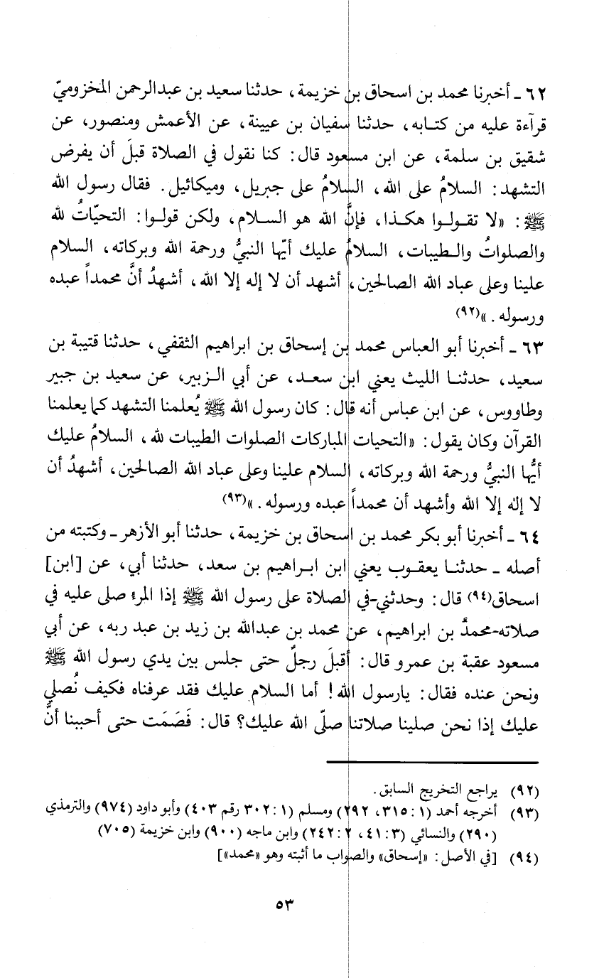 62 - أَخْبَرَنَا مُحَمَّدُ بْنُ إِسْحَاقَ بْنِ خُزَيْمَةَ، حَدَّثَنَا سَعِيدُ بْنُ عَبْدِ الرَّحْمَنِ الْمَخْزُومِيُّ، قِرَاءَةً عَلَيْهِ مِنْ كِتَابِهِ، حَدَّثَنَا سُفْيَانُ بْنُ عُيَيْنَةَ، عَنِ الْأَعْمَشِ، وَمَنْصُورٍ، عَنْ شَقِيقِ بْنِ سَلَمَةَ، عَنِ ابْنِ مَسْعُودٍ قَالَ: كُنَّا نَقُولُ فِي الصَّلَاةِ قَبْلَ أَنْ يُفْرَضَ عَلَيْنَا التَّشَهُّدُ: السَّلَامُ عَلَى اللَّهِ السَّلَامُ عَلَى جِبْرِيلَ وَمِيكَائِيلَ، فَقَالَ رَسُولُ اللَّهِ صَلَّى اللهُ عَلَيْهِ وَسَلَّمَ: §«لَا تَقُولُوا هَكَذَا فَإِنَّ اللَّهَ هُوَ السَّلَامُ وَلَكِنْ قُولُوا التَّحِيَّاتُ لِلَّهِ وَالصَّلَوَاتُ وَالطَّيِّبَاتُ، السَّلَامُ عَلَيْكَ أَيُّهَا النَّبِيُّ وَرَحْمَةُ اللَّهِ وَبَرَكَاتُهُ وَالسَّلَامُ عَلَيْنَا وَعَلَى عَبَّادِ اللَّهِ الصَّالِحِينَ أَشْهَدُ أَنْ لَا إِلَهَ إِلَّا اللَّهُ أَشْهَدُ أَنَّ مُحَمَّدًا عَبْدُهُ وَرَسُولُهُ»