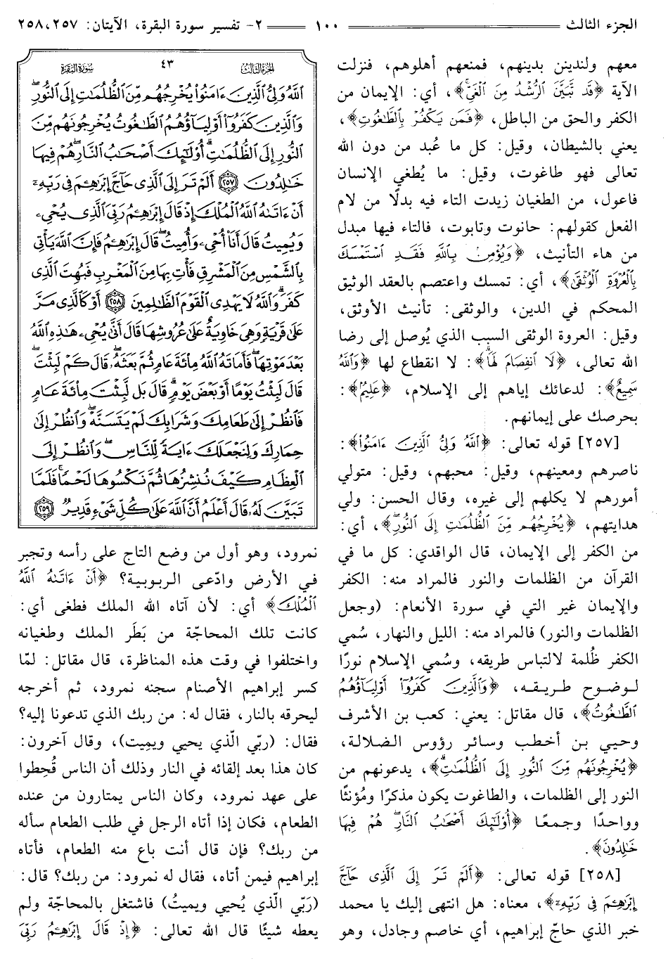 [257] قَوْلُهُ تَعَالَى: {اللَّهُ وَلِيُّ الَّذِينَ آمَنُوا} [البقرة: 257] نَاصِرُهُمْ وَمُعِينُهُمْ، وَقِيلَ: مُحِبُّهُمْ، وَقِيلَ: مُتَوَلِّي أُمُورَهُمْ لَا يَكِلُهُمْ إِلَى غَيْرِهِ، وَقَالَ الْحَسَنُ: وَلِيُّ هِدَايَتِهِمْ، {يُخْرِجُهُمْ مِنَ الظُّلُمَاتِ إِلَى النُّورِ} [البقرة: 257] أَيْ: مِنَ الْكُفْرِ إِلَى الْإِيمَانِ، قَالَ الْوَاقِدِيُّ: كُلُّ مَا فِي الْقُرْآنِ مِنَ الظُّلُمَاتِ وَالنُّورِ فَالْمُرَادُ مِنْهُ: الْكُفْرُ وَالْإِيمَانُ غَيْرُ الَّتِي فِي سُورَةِ الْأَنْعَامِ: {وَجَعَلَ الظُّلُمَاتِ وَالنُّورَ} [الأنعام: 1] فَالْمُرَادُ مِنْهُ: اللَّيْلُ وَالنَّهَارُ، سُمي الْكُفْرُ ظُلْمَةً لِالْتِبَاسِ طَرِيقِهِ، وَسُمِّيَ الْإِسْلَامُ نُورًا لِوُضُوحِ طَرِيقِهِ، {وَالَّذِينَ كَفَرُوا أَوْلِيَاؤُهُمُ الطَّاغُوتُ} [البقرة: 257] قَالَ مُقَاتِلٌ: يَعْنِي: كَعْبَ بْنَ الْأَشْرَفِ وَحُيَيَّ بْنَ أَخْطَبَ وَسَائِرَ رؤوس الضَّلَالَةِ، {يُخْرِجُونَهُمْ مِنَ النُّورِ إِلَى الظُّلُمَاتِ} [البقرة: 257] يَدْعُونَهُمْ مِنَ النُّورِ إِلَى الظُّلُمَاتِ، وَالطَّاغُوتُ يَكُونُ مُذَكَّرًا وَمُؤَنَّثًا وَوَاحِدًا وجمعا {أُولَئِكَ أَصْحَابُ النَّارِ هُمْ فِيهَا خَالِدُونَ} [البقرة: 257]