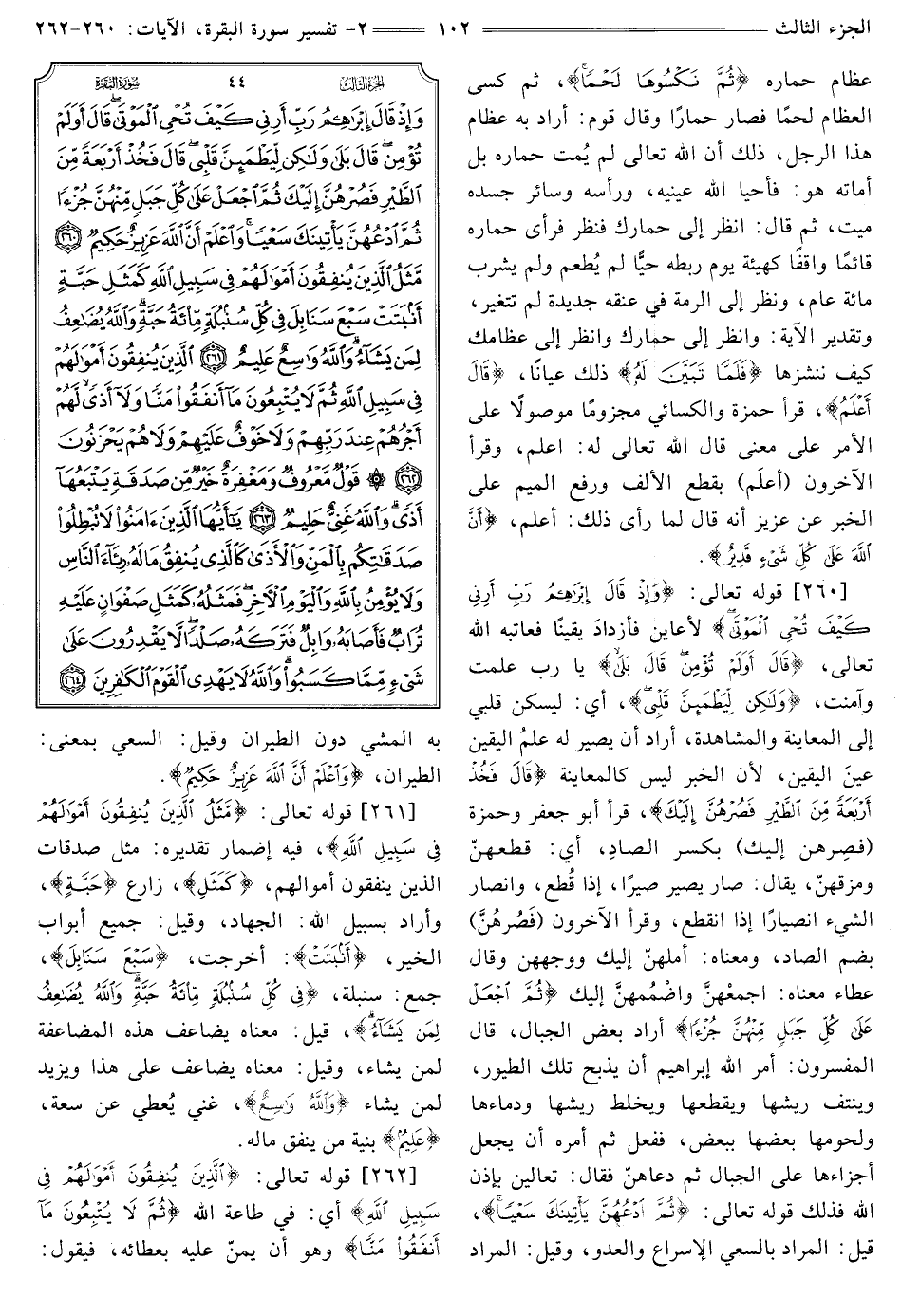 [260] قَوْلُهُ تَعَالَى: {وَإِذْ قَالَ إِبْرَاهِيمُ رَبِّ أَرِنِي كَيْفَ تُحْيِ الْمَوْتَى} [البقرة: 260] لِأُعَايِنَ فَأَزْدَادَ يَقِينًا فَعَاتَبَهُ اللَّهُ تَعَالَى، {قَالَ أَوَلَمْ تُؤْمِنْ قَالَ بَلَى} [البقرة: 260] يَا رَبِّ عَلِمْتُ وَآمَنْتُ، {وَلَكِنْ لِيَطْمَئِنَّ قَلْبِي} [البقرة: 260] أَيْ: لِيَسْكُنَ قَلْبِي إِلَى الْمُعَايَنَةِ وَالْمُشَاهَدَةِ، أَرَادَ أَنْ يَصِيرَ لَهُ عِلْمُ الْيَقِينِ عَيْنَ الْيَقِينِ، لِأَنَّ الخبر ليس كالمعاينة {قَالَ فَخُذْ أَرْبَعَةً مِنَ الطَّيْرِ فَصُرْهُنَّ إِلَيْكَ} [البقرة: 260] قَرَأَ أَبُو جَعْفَرٍ وَحَمْزَةُ (فَصُرْهُنَّ إِلَيْكَ) بِكَسْرِ الصَّادِ، أَيْ: قَطِّعْهُنَّ وَمَزِّقْهُنَّ، يُقَالُ: صَارَ يَصِيرُ صَيْرًا، إِذَا قَطَعَ، وَانْصَارَ الشَّيْءُ انْصِيَارًا إذا انقطع، وَقَرَأَ الْآخَرُونَ (فَصُرْهُنَّ) بِضَمِّ الصَّادِ، ومعناه: أملهن إليك ووجههن وَقَالَ عَطَاءٌ مَعْنَاهُ: اجْمَعْهُنَّ وَاضْمُمْهُنَّ إِلَيْكَ {ثُمَّ اجْعَلْ عَلَى كُلِّ جَبَلٍ مِنْهُنَّ جُزْءًا} [البقرة: 260] أراد بعض الجبال، قال المفسرون: أَمَرَ اللَّهُ إِبْرَاهِيمَ أَنْ يَذْبَحَ تِلْكَ الطُّيُورَ، وَيَنْتِفَ رِيشَهَا وَيَقْطَعَهَا وَيَخْلِطَ رِيشَهَا وَدِمَاءَهَا وَلُحُومَهَا بَعْضَهَا بِبَعْضٍ، فَفَعَلَ ثُمَّ أَمَرَهُ أَنْ يجعل أجزاءها على الجبال ثم دعاهن فقال: تعالين بإذن الله فَذَلِكَ قَوْلُهُ تَعَالَى: {ثُمَّ ادْعُهُنَّ يَأْتِينَكَ سَعْيًا} [البقرة: 260] قِيلَ: الْمُرَادُ بِالسَّعْيِ الْإِسْرَاعُ وَالْعَدْوُ، وَقِيلَ: الْمُرَادُ بِهِ الْمَشْيُ دُونَ الطيران وَقِيلَ: السَّعْيُ بِمَعْنَى: الطَّيَرَانِ، {وَاعْلَمْ أَنَّ اللَّهَ عَزِيزٌ حَكِيمٌ} [البقرة: 260]
