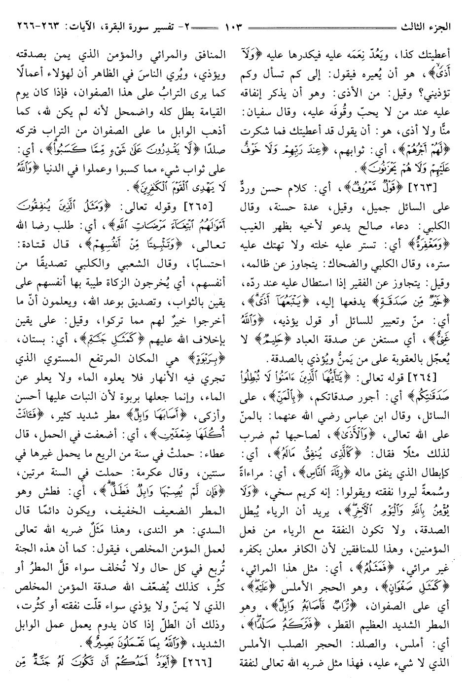 [264] ، قَوْلُهُ تَعَالَى: {يَا أَيُّهَا الَّذِينَ آمَنُوا لَا تُبْطِلُوا صَدَقَاتِكُمْ} [البقرة: 264] أي: أجور صدقاتكم، {بِالْمَنِّ} [البقرة: 264] عَلَى السَّائِلِ، وَقَالَ ابْنُ عَبَّاسٍ رَضِيَ اللَّهُ عَنْهُمَا: بِالْمَنِّ عَلَى الله تعالى، {وَالْأَذَى} [البقرة: 264] لِصَاحِبِهَا ثُمَّ ضَرَبَ لِذَلِكَ مَثَلًا فقال: {كَالَّذِي يُنْفِقُ مَالَهُ} [البقرة: 264] أَيْ: كَإِبْطَالِ الَّذِي يُنْفِقُ مَالَهُ {رِئَاءَ النَّاسِ} [البقرة: 264] أَيْ: مُرَاءَاةً وَسُمْعَةً لِيَرَوْا نَفَقَتَهُ وَيَقُولُوا: إِنَّهُ كَرِيمٌ سَخِيٌّ، {وَلَا يُؤْمِنُ بِاللَّهِ وَالْيَوْمِ الْآخِرِ} [البقرة: 264] يُرِيدُ أَنَّ الرِّيَاءَ يُبْطِلُ الصَّدَقَةَ، وَلَا تَكُونُ النَّفَقَةُ مَعَ الرِّيَاءِ مِنْ فِعْلِ الْمُؤْمِنِينَ، وَهَذَا لِلْمُنَافِقِينَ لِأَنَّ الْكَافِرَ مُعْلِنٌ بِكُفْرِهِ غَيْرُ مرائي، {فَمَثَلُهُ} [البقرة: 264] أَيْ: مَثَلُ هَذَا الْمُرَائِي، {كَمَثَلِ صَفْوَانٍ} [البقرة: 264] وهو الحجر الأملس {عَلَيْهِ} [البقرة: 264] أَيْ عَلَى الصَّفْوَانِ، {تُرَابٌ فَأَصَابَهُ وَابِلٌ} [البقرة: 264] وهو الْمَطَرُ الشَّدِيدُ الْعَظِيمُ الْقَطْرِ، {فَتَرَكَهُ صَلْدًا} [البقرة: 264] أَيْ: أَمْلَسَ، وَالصَّلْدُ: الْحَجَرُ الصُّلْبُ الْأَمْلَسُ الَّذِي لَا شَيْءَ عَلَيْهِ، فَهَذَا مَثَلٌ ضَرَبَهُ اللَّهُ تَعَالَى لِنَفَقَةِ الْمُنَافِقِ وَالْمُرَائِي وَالْمُؤْمِنَ الَّذِي يَمُنُّ بِصَدَقَتِهِ وَيُؤْذِي، وَيُرِي النَّاسَ فِي الظَّاهِرِ أَنَّ لِهَؤُلَاءِ أَعْمَالًا كَمَا يُرَى التُّرَابُ عَلَى هَذَا الصَّفْوَانِ، فَإِذَا كَانَ يَوْمُ الْقِيَامَةِ بَطَلَ كُلُّهُ وَاضْمَحَلَّ لِأَنَّهُ لَمْ يكن لله، كَمَا أَذْهَبَ الْوَابِلُ مَا عَلَى الصَّفْوَانِ مِنَ التُّرَابِ فَتَرَكَهُ صَلْدًا، {لَا يَقْدِرُونَ عَلَى شَيْءٍ مِمَّا كَسَبُوا} [البقرة: 264] أَيْ: عَلَى ثَوَابِ شَيْءٍ مِمَّا كَسَبُوا وَعَمِلُوا فِي الدُّنْيَا {وَاللَّهُ لَا يَهْدِي الْقَوْمَ الْكَافِرِينَ} [البقرة: 264]