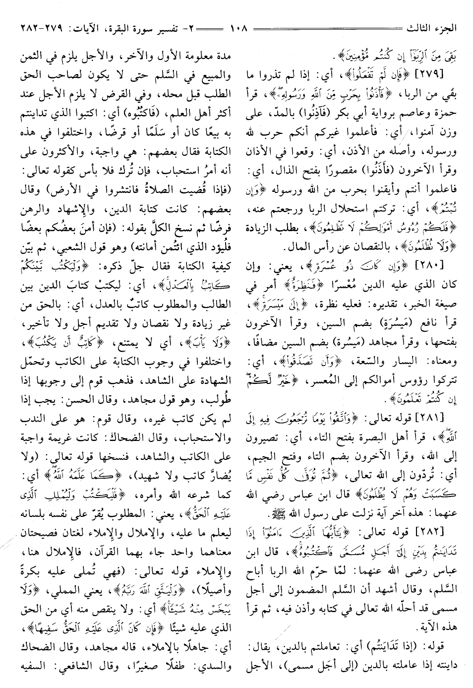 [282] قَوْلُهُ تَعَالَى: {يَا أَيُّهَا الَّذِينَ آمَنُوا إِذَا تَدَايَنْتُمْ بِدَيْنٍ إِلَى أَجَلٍ مُسَمًّى فَاكْتُبُوهُ} [البقرة: 282] قَالَ ابْنُ عَبَّاسٍ رَضِيَ اللَّهُ عَنْهُمَا: لَمَّا حَرَّمَ اللَّهُ الرِّبَا أَبَاحَ السَّلم، وَقَالَ أَشْهَدُ أَنَّ السَّلم الْمَضْمُونَ إِلَى أَجَلٍ مُسَمًّى قَدْ أَحَلَّهُ اللَّهُ تَعَالَى فِي كِتَابِهِ وأذن فيه، ثم قرأ هذه الآية.