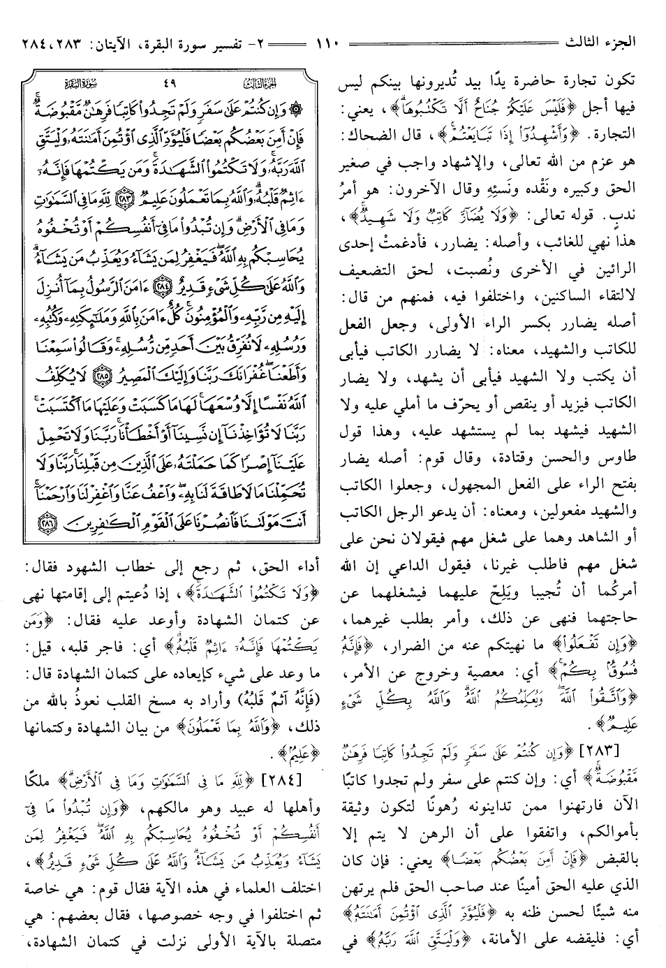[283] ، {وَإِنْ كُنْتُمْ عَلَى سَفَرٍ وَلَمْ تَجِدُوا كَاتِبًا فَرِهَانٌ مَقْبُوضَةٌ} [البقرة: 283] أي: وَإِنْ كُنْتُمْ عَلَى سَفَرٍ وَلَمْ تجدوا كاتبا الآن فَارْتَهِنُوا مِمَّنْ تُدَايِنُونَهُ رُهُونًا لِتَكُونَ وثيقة بِأَمْوَالِكُمْ، وَاتَّفَقُوا عَلَى أَنَّ الرَّهْنَ لا يتم إلا بالقبض {فَإِنْ أَمِنَ بَعْضُكُمْ بَعْضًا} [البقرة: 283] يَعْنِي: فَإِنْ كَانَ الَّذِي عَلَيْهِ الْحَقُّ أَمِينًا عِنْدَ صَاحِبِ الْحَقِّ فَلَمْ يَرْتَهِنْ مِنْهُ شَيْئًا لِحُسْنِ ظَنِّهِ بِهِ {فَلْيُؤَدِّ الَّذِي اؤْتُمِنَ أَمَانَتَهُ} [البقرة: 283] أَيْ: فَلْيَقْضِهِ عَلَى الْأَمَانَةِ، {وَلْيَتَّقِ اللَّهَ رَبَّهُ} [البقرة: 283] فِي أَدَاءِ الْحَقِّ، ثُمَّ رَجَعَ إلى خطاب الشهود فقال: {وَلَا تَكْتُمُوا الشَّهَادَةَ} [البقرة: 283] إِذَا دُعِيتُمْ إِلَى إِقَامَتِهَا، نَهَى عَنْ كِتْمَانِ الشَّهَادَةِ وَأَوْعَدَ عَلَيْهِ فَقَالَ: {وَمَنْ يَكْتُمْهَا فَإِنَّهُ آثِمٌ قَلْبُهُ} [البقرة: 283] أَيْ: فَاجِرٌ قَلْبُهُ، قِيلَ: مَا وعد عَلَى شَيْءٍ كَإِيعَادِهِ عَلَى كِتْمَانِ الشَّهَادَةِ قَالَ: {فَإِنَّهُ آثِمٌ قَلْبُهُ} [البقرة: 283] وَأَرَادَ بِهِ مَسْخَ الْقَلْبِ نَعُوذُ بِاللَّهِ مِنْ ذَلِكَ، {وَاللَّهُ بِمَا تَعْمَلُونَ} [البقرة: 283] من بيان الشهادة وكتمانها {عَلِيمٌ} [البقرة: 283]