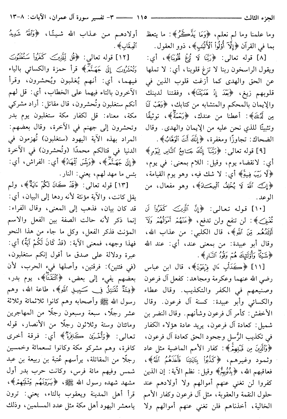 [8] ، قَوْلُهُ تَعَالَى: {رَبَّنَا لَا تُزِغْ قُلُوبَنَا} [آل عمران: 8] أَيْ: وَيَقُولُ الرَّاسِخُونَ رَبَّنَا لَا تُزِغْ قُلُوبَنَا، أَيْ: لَا تُمِلْهَا عَنِ الْحَقِّ وَالْهُدَى كَمَا أَزَغْتَ قُلُوبَ الَّذِينَ فِي قُلُوبِهِمْ زَيْغٌ، {بَعْدَ إِذْ هَدَيْتَنَا} [آل عمران: 8] وَفَّقْتَنَا لِدِينِكَ وَالْإِيمَانِ بِالْمُحْكَمِ وَالْمُتَشَابِهِ مِنْ كِتَابِكَ، {وَهَبْ لَنَا مِنْ لَدُنْكَ} [آل عمران: 8] أعطنا من عندك، {رَحْمَةً} [آل عمران: 8] توثيقا وَتَثْبِيتًا لِلَّذِي نَحْنُ عَلَيْهِ مِنَ الْإِيمَانِ وَالْهُدَى. وَقَالَ الضَّحَّاكُ: تَجَاوُزًا ومغفرة، {إِنَّكَ أَنْتَ الْوَهَّابُ} [آل عمران: 8]
