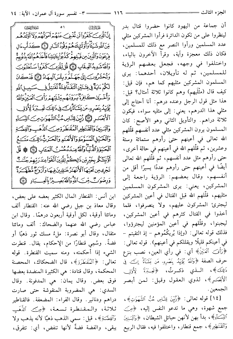 [14] قَوْلُهُ تَعَالَى: {زُيِّنَ لِلنَّاسِ حُبُّ الشَّهَوَاتِ} [آل عمران: 14] جَمْعُ شَهْوَةٍ، وَهِيَ مَا تَدْعُو النفس إليه، {مِنَ النِّسَاءِ} [آل عمران: 14] بَدَأَ بِهِنَّ لِأَنَّهُنَّ حَبَائِلُ الشَّيْطَانِ، {وَالْبَنِينَ وَالْقَنَاطِيرِ} [آل عمران: 14] جَمْعُ قِنْطَارٍ، وَاخْتَلَفُوا فِيهِ، فَقَالَ الرَّبِيعُ بْنُ أَنَسٍ: الْقِنْطَارُ الْمَالُ الْكَثِيرُ بَعْضُهُ عَلَى بَعْضٍ، وَقَالَ مُعَاذُ بْنُ جَبَلٍ رَضِيَ اللَّهُ عَنْهُ: الْقِنْطَارُ أَلْفٌ وَمِائَتَا أُوقِيَّةٍ، لكل أوقية أربعون درهما. وَقَالَ ابْنُ عَبَّاسٍ - رَضِيَ اللَّهُ عَنْهُمَا - وَالضَّحَّاكُ: أَلْفٌ وَمِائَتَا مِثْقَالٍ، وقال أبو نصرة: مِلْءُ مَسْكِ ثَوْرٍ ذَهَبًا أَوْ فِضَّةً. وَسُمِّيَ قِنْطَارًا مِنَ الْإِحْكَامِ، يُقَالُ: قَنْطَرْتُ الشَّيْءَ إِذَا أَحْكَمْتُهُ، وَمِنْهُ سُمِّيَتِ الْقَنْطَرَةُ. قَوْلُهُ تَعَالَى: {الْمُقَنْطَرَةِ} [آل عمران: 14] قَالَ الضَّحَّاكُ: الْمُحَصَّنَةُ الْمُحْكَمَةُ، وَقَالَ قَتَادَةُ: هِيَ الْكَثِيرَةُ الْمُنَضَّدَةُ بَعْضُهَا فوق بعض. وقال يمان: هي المدفونة. وقال السدي: هي الْمَضْرُوبَةُ الْمَنْقُوشَةُ حَتَّى صَارَتْ دَرَاهِمَ وَدَنَانِيرَ. وَقَالَ الْفَرَّاءُ: الْمُضَعَّفَةُ. فَالْقَنَاطِيرُ ثَلَاثَةٌ، وَالْمُقَنْطَرَةُ تِسْعَةٌ، {مِنَ الذَّهَبِ وَالْفِضَّةِ} [آل عمران: 14] قيل: سُمِّيَ الذَّهَبُ ذَهَبًا لِأَنَّهُ يَذْهَبُ ولا يبقى، والفضة فضة لِأَنَّهَا تَنْفَضُّ، أَيْ: تَتَفَرَّقُ،