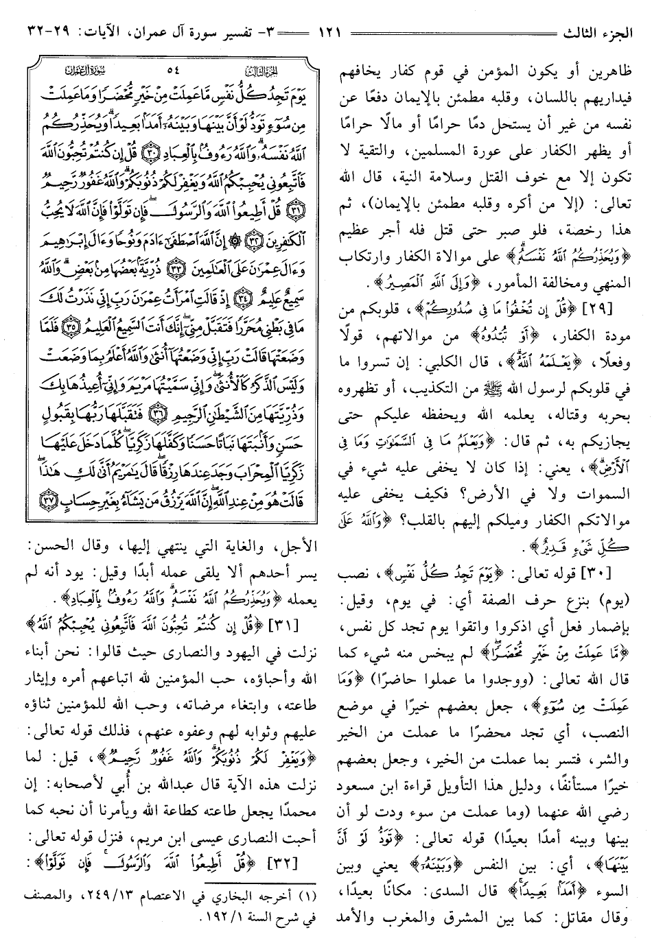 [31] {قُلْ إِنْ كُنْتُمْ تُحِبُّونَ اللَّهَ فَاتَّبِعُونِي يُحْبِبْكُمُ اللَّهُ} [آل عمران: 31] نَزَلَتْ فِي الْيَهُودِ وَالنَّصَارَى حَيْثُ قَالُوا: نَحْنُ أَبْنَاءُ اللَّهِ وَأَحِبَّاؤُهُ، حب الْمُؤْمِنِينَ لِلَّهِ اتِّبَاعُهُمْ أَمْرَهُ وَإِيثَارُ طَاعَتِهِ، وَابْتِغَاءُ مَرْضَاتِهِ، وَحُبُّ اللَّهِ لِلْمُؤْمِنِينَ ثَنَاؤُهُ عَلَيْهِمْ وَثَوَابُهُ لَهُمْ وَعَفْوُهُ عَنْهُمْ، فَذَلِكَ قَوْلُهُ تَعَالَى: {وَيَغْفِرْ لَكُمْ ذُنُوبَكُمْ وَاللَّهُ غَفُورٌ رَحِيمٌ} [آل عمران: 31] قيل: لِمَا نَزَلَتْ هَذِهِ الْآيَةُ قَالَ عَبْدُ اللَّهِ بْنُ أُبَيٍّ لِأَصْحَابِهِ: إِنَّ مُحَمَّدًا يَجْعَلُ طَاعَتَهُ كَطَاعَةِ اللَّهِ وَيَأْمُرُنَا أَنْ نُحِبَّهُ كَمَا أَحَبَّتِ النَّصَارَى عِيسَى ابْنَ مَرْيَمَ، فَنَزَلَ قَوْلُهُ تَعَالَى:
