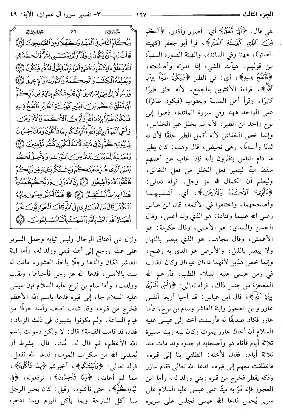 هي قال: {أَنِّي أَخْلُقُ} [آل عمران: 49] أَيْ: أُصَوِّرُ وَأُقَدِّرُ، {لَكُمْ مِنَ الطِّينِ كَهَيْئَةِ الطَّيْرِ} [آل عمران: 49] قَرَأَ أَبُو جَعْفَرٍ (كَهَيْئَةِ الطَّائِرِ) ، هَاهُنَا وَفِي الْمَائِدَةِ، وَالْهَيْئَةُ الصُّورَةُ الْمُهَيَّأَةُ مِنْ قَوْلِهِمْ: هَيَّأْتُ الشَّيْءَ إِذَا قَدَّرْتُهُ وَأَصْلَحْتُهُ، {فَأَنْفُخُ فِيهِ} [آل عمران: 49] أَيْ: فِي الطَّيْرِ {فَيَكُونُ طَيْرًا بِإِذْنِ اللَّهِ} [آل عمران: 49] قِرَاءَةُ الْأَكْثَرِينَ بِالْجَمْعِ، لِأَنَّهُ خَلَقَ طَيْرًا كَثِيرًا، وَقَرَأَ أَهْلُ الْمَدِينَةِ وَيَعْقُوبُ (فَيَكُونُ طَائِرًا) عَلَى الْوَاحِدِ هَاهُنَا وَفِي سُورَةِ الْمَائِدَةِ، ذَهَبُوا إِلَى نَوْعٍ وَاحِدٍ مِنَ الطَّيْرِ، لِأَنَّهُ لَمْ يَخْلُقْ غَيْرَ الْخُفَّاشِ، وَإِنَّمَا خَصَّ الْخُفَّاشَ لِأَنَّهُ أَكْمَلُ الطير خلقا؛ لأن له ثَدْيًا وَأَسْنَانًا، وَهِيَ تَحِيضُ، قَالَ وَهْبٌ: كَانَ يَطِيرُ مَا دَامَ النَّاسُ يَنْظُرُونَ إِلَيْهِ فَإِذَا غَابَ عَنْ أَعْيُنِهِمْ سَقَطَ مَيِّتًا لِيَتَمَيَّزَ فِعْلُ الْخَلْقِ مِنْ فِعْلِ الْخَالِقِ، وَلِيَعْلَمَ أَنَّ الْكَمَالَ لِلَّهِ عَزَّ وجل، قوله تعالى: {وَأُبْرِئُ الْأَكْمَهَ وَالْأَبْرَصَ} [آل عمران: 49] أَيْ: أَشْفِيهِمَا وَأُصَحِّحُهُمَا، وَاخْتَلَفُوا فِي الأكمه، قَالَ ابْنُ عَبَّاسٍ - رَضِيَ اللَّهُ عنهما - وَقَتَادَةُ: هُوَ الَّذِي وُلِدَ أَعْمَى، وَقَالَ الْحَسَنُ وَالسُّدِّيُّ: هُوَ الْأَعْمَى، وَقَالَ عِكْرِمَةُ: هُوَ الْأَعْمَشُ، وَقَالَ مُجَاهِدٌ: هُوَ الَّذِي يُبْصِرُ بِالنَّهَارِ ولا يبصر بالليل، والأبرص هو الَّذِي بِهِ وَضَحٌ، وَإِنَّمَا خَصَّ هَذَيْنِ لِأَنَّهُمَا دَاءَانِ عَيَاءَانِ، وَكَانَ الْغَالِبُ فِي زَمَنِ عِيسَى - عَلَيْهِ السلام - الطب، فأراهم الله المعجزة من جنس ذلك، قَوْلُهُ تَعَالَى: {وَأُحْيِي الْمَوْتَى بِإِذْنِ اللَّهِ} [آلِ عِمْرَانَ: 49] قَالَ ابْنُ عَبَّاسٍ: قَدْ أَحْيَا أَرْبَعَةَ أَنْفُسٍ عَازِرَ وَابْنَ الْعَجُوزِ وَابْنَةَ الْعَاشِرِ وَسَامَ بْنَ نُوحٍ، فَأَمَّا عَازِرُ فَكَانَ صَدِيقًا لَهُ فَأَرْسَلَتْ أُخْتُهُ إِلَى عِيسَى - عَلَيْهِ السَّلَامُ - أَنَّ أَخَاكَ عَازِرَ يَمُوتُ وَكَانَ بَيْنَهُ وَبَيْنَهُ مَسِيرَةَ ثَلَاثَةِ أَيَّامٍ فَأَتَاهُ هُوَ وأصحابه فوجدوه وقد مَاتَ مُنْذُ ثَلَاثَةِ أَيَّامٍ، فَقَالَ لِأُخْتِهِ: انْطَلِقِي بِنَا إِلَى قَبْرِهِ، فَانْطَلَقَتْ مَعَهُمْ إِلَى قَبْرِهِ، فَدَعَا الله تعالى فقام عازر ودكه يَقْطُرُ فَخَرَجَ مِنْ قَبْرِهِ وَبَقِيَ وَوُلِدَ لَهُ، وَأَمَّا ابْنُ الْعَجُوزِ فإنه مُرّ بِهِ مَيِّتًا عَلَى عِيسَى - عَلَيْهِ السَّلَامُ - عَلَى سَرِيرٍ يُحْمَلُ فَدَعَا اللَّهَ عِيسَى فَجَلَسَ عَلَى سَرِيرِهِ، وَنَزَلَ عَنْ أَعْنَاقِ الرِّجَالِ وَلَبِسَ ثِيَابَهُ وَحَمَلَ السَّرِيرَ عَلَى عُنُقِهِ وَرَجَعَ إِلَى أَهْلِهِ فَبَقِيَ وَوُلِدَ لَهُ، وَأَمَّا ابْنَةُ الْعَاشِرِ فكان والدها رَجُلًا يَأْخُذُ الْعُشُورَ، مَاتَتْ لَهُ بِنْتٌ بِالْأَمْسِ، فَدَعَا اللَّهَ - عَزَّ وجل - فأحياها، وبقيت وولدت، وَأَمَّا سَامُ بْنُ نُوحٍ عَلَيْهِ السَّلَامُ فَإِنَّ عِيسَى - عَلَيْهِ السَّلَامُ - جَاءَ إِلَى قَبْرِهِ فَدَعَا بِاسْمِ اللَّهِ الْأَعْظَمِ فَخَرَجَ مِنْ قَبْرِهِ، وَقَدْ شَابَ نِصْفُ رَأْسِهِ خَوْفًا مِنْ قِيَامِ السَّاعَةِ، وَلَمْ يَكُونُوا يَشِيبُونَ فِي ذَلِكَ الزَّمَانِ، فَقَالَ قَدْ قَامَتِ الْقِيَامَةُ؟ قَالَ: لَا وَلَكِنَّ دَعَوْتُكَ بِاسْمِ اللَّهِ الْأَعْظَمِ، ثُمَّ قَالَ لَهُ: مُتْ، قَالَ: بِشَرْطِ أَنْ يُعِيذَنِي اللَّهُ مِنْ سَكَرَاتِ الْمَوْتِ، فَدَعَا اللَّهَ فَفَعَلَ. قوله تعالى: {وَأُنَبِّئُكُمْ} [آل عمران: 49] أخبركم {بِمَا تَأْكُلُونَ} [آل عم