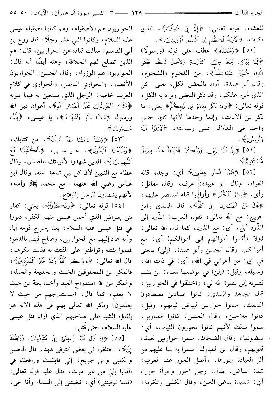 [52] {فَلَمَّا أَحَسَّ عِيسَى} [آل عمران: 52] أَيْ: وَجَدَ، قَالَهُ الْفَرَّاءُ، وَقَالَ أَبُو عُبَيْدَةَ: عَرَفَ، وَقَالَ مُقَاتِلٌ: رأى، {مِنْهُمُ الْكُفْرَ} [آل عمران: 52] وأرادوا قتله استنصر عليهم، {قَالَ مَنْ أَنْصَارِي إِلَى اللَّهِ} [آل عمران: 52] قَالَ السُّدِّيُّ وَابْنُ جُرَيْجٍ: مَعَ اللَّهِ تَعَالَى، تَقُولُ الْعَرَبُ: الذَّوْدُ إِلَى الذَّوْدِ إِبِلٌ، أَيْ: مَعَ الذود، كَمَا قَالَ اللَّهُ تَعَالَى: {وَلَا تَأْكُلُوا أَمْوَالَهُمْ إِلَى أَمْوَالِكُمْ} [النِّسَاءِ: 2] أَيْ: مَعَ أَمْوَالِكُمْ، وَقَالَ الْحَسَنُ وَأَبُو عُبَيْدَةَ (إِلَى) بِمَعْنَى فِي، أَيْ: مَنْ أَعْوَانِي فِي اللَّهِ، أَيْ: فِي ذَاتِ اللَّهِ، وَسَبِيلِهِ، وقيل: (إِلَى) في موضعها مَعْنَاهُ: مَنْ يَضُمُّ نُصْرَتَهُ إِلَى نُصْرَةِ اللَّهِ لِي، وَاخْتَلَفُوا فِي الْحَوَارِيِّينَ، قَالَ مُجَاهِدٌ وَالسُّدِّيُّ: كَانُوا صَيَّادِينَ يَصْطَادُونَ السَّمَكَ، سُمُّوا حَوَارِيِّينَ لِبَيَاضِ ثِيَابِهِمْ، وَقِيلَ: كَانُوا مَلَّاحِينَ، وَقَالَ الْحَسَنُ: كَانُوا قَصَّارِينَ، سُمُّوا بِذَلِكَ لِأَنَّهُمْ كَانُوا يُحَوِّرُونَ الثِّيَابَ، أي: يبيضونها، وَقَالَ الضَّحَّاكُ: سُمُّوا حَوَارِيِّينَ لِصَفَاءِ قُلُوبِهِمْ، وَقَالَ ابْنُ الْمُبَارَكِ: سُمُّوا بِهِ لِمَا عَلَيْهِمْ مِنْ أَثَرِ الْعِبَادَةِ وَنُورِهَا، وَأَصْلُ الْحَوَرِ عِنْدَ الْعَرَبِ: شِدَّةُ الْبَيَاضِ، يُقَالُ: رَجُلٌ أَحْوَرُ وَامْرَأَةٌ حَوْرَاءُ أَيْ: شَدِيدَةُ بَيَاضِ الْعَيْنِ، وَقَالَ الْكَلْبِيُّ وَعِكْرِمَةُ: الْحَوَارِيُّونَ هُمُ الْأَصْفِيَاءُ، وَهُمْ كَانُوا أَصْفِيَاءَ عِيسَى عَلَيْهِ السَّلَامُ، وَكَانُوا اثْنَيْ عَشَرَ رَجُلًا، قَالَ رَوْحُ بن أبي الْقَاسِمِ: سَأَلْتُ قَتَادَةَ عَنِ الْحَوَارِيِّينَ، قال: هم الذين تصلح لهم الخلافة، وعنه أيضا أَنَّهُ قَالَ: الْحَوَارِيُّونَ هُمُ الْوُزَرَاءُ، وَقَالَ الْحَسَنُ: الْحَوَارِيُّونَ الْأَنْصَارُ، وَالْحَوَارِيُّ النَّاصِرُ، وَالْحَوَارِيُّ فِي كَلَامِ الْعَرَبِ خَاصَّةً: الرَّجُلُ الَّذِي يَسْتَعِينُ بِهِ فيما ينويه {قَالَ الْحَوَارِيُّونَ نَحْنُ أَنْصَارُ اللَّهِ} [آل عمران: 52] أَعْوَانُ دِينِ اللَّهِ وَرَسُولِهِ {آمَنَّا بِاللَّهِ وَاشْهَدْ} [آل عمران: 52] يا عيسى، {بِأَنَّا مُسْلِمُونَ} [آل عمران: 52]