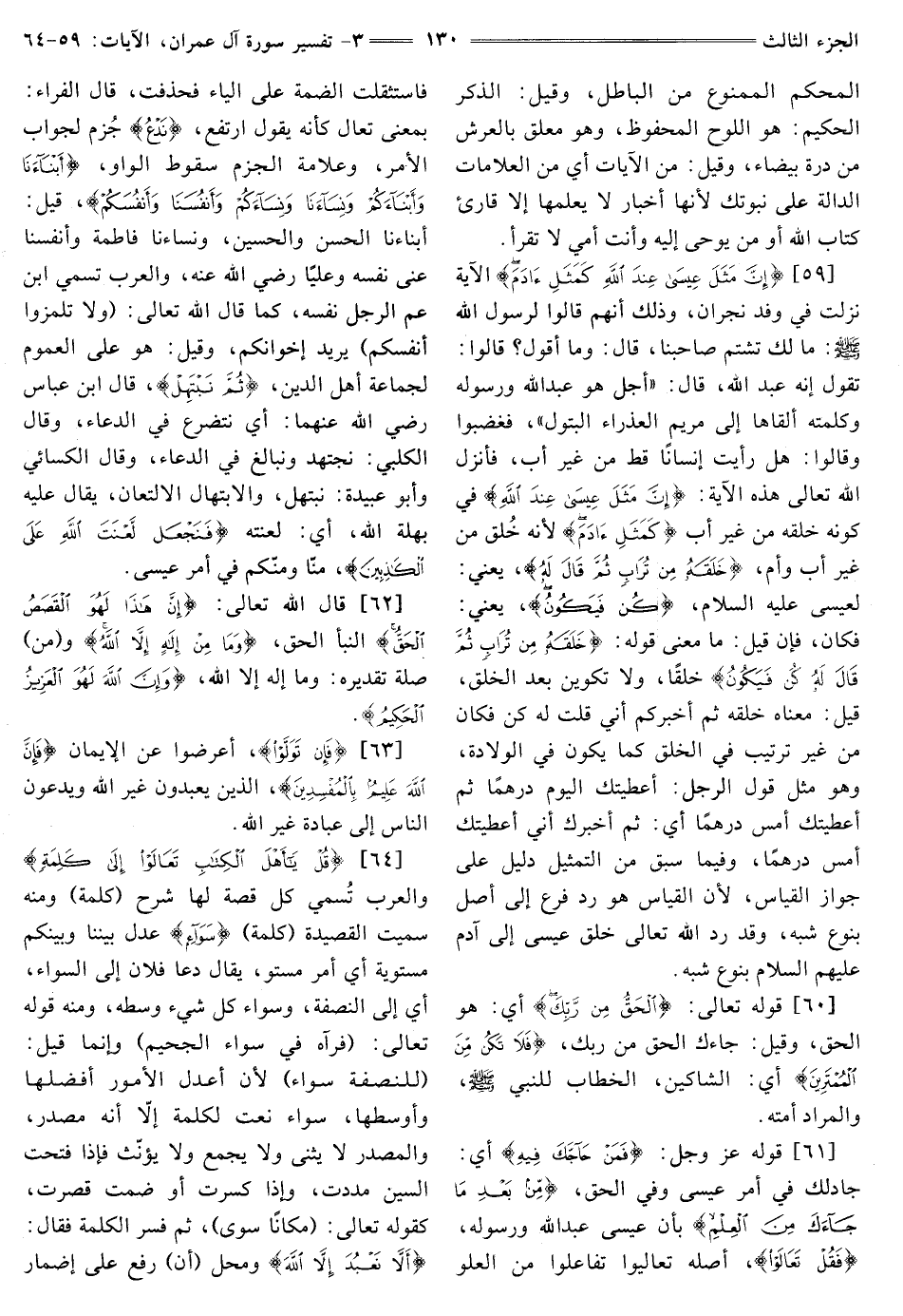 [64] {قُلْ يَا أَهْلَ الْكِتَابِ تَعَالَوْا إِلَى كَلِمَةٍ} [آل عمران: 64] وَالْعَرَبُ تُسَمِّي كُلَّ قِصَّةٍ لَهَا شَرْحٌ (كَلِمَةً) وَمِنْهُ سُمِّيَتِ الْقَصِيدَةُ (كلمة) {سَوَاءٍ} [آل عمران: 64] عدل {بَيْنَنَا وَبَيْنَكُمْ} [آل عمران: 64] مُسْتَوِيَةٍ أَيْ أَمْرٍ مُسْتَوٍ، يُقَالُ دَعَا فَلَانَ إِلَى السَّوَاءِ، أَيْ إِلَى النَّصَفَةِ، وَسَوَاءُ كُلِّ شَيْءٍ وَسَطُهُ، وَمِنْهُ قَوْلُهُ تَعَالَى: {فَرَآهُ فِي سَوَاءِ الْجَحِيمِ} [الصَّافَّاتِ: 55] وَإِنَّمَا قيل: للنصفة سواء؛ لأن أعدل الأمور أفضلها وأوسطها، سواء نَعْتٌ لِكَلِمَةٍ إِلَّا أَنَّهُ مَصْدَرٌ، وَالْمَصْدَرُ لَا يُثَنَّى وَلَا يُجْمَعُ ولا يؤنث فَإِذَا فَتَحْتَ السِّينَ مَدَدْتَ، وَإِذَا كسرت أو ضمت قَصَرْتَ، كَقَوْلِهِ تَعَالَى: {مَكَانًا سُوًى} [طه: 58] ثُمَّ فَسَّرَ الْكَلِمَةَ فَقَالَ. {أَلَّا نَعْبُدَ إِلَّا اللَّهَ} [آل عمران: 64] وَمَحَلُّ (أَنْ) رَفْعٌ عَلَى إِضْمَارِ
