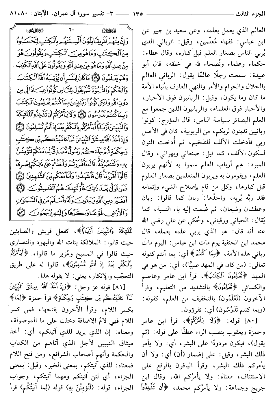[80] قوله: {وَلَا يَأْمُرَكُمْ} [آل عمران: 80] قَرَأَ ابْنُ عَامِرٍ وَحَمْزَةُ وَيَعْقُوبُ بِنَصْبِ الرَّاءِ عَطْفًا عَلَى قَوْلِهِ: (ثُمَّ يَقُولَ) ، فَيَكُونُ مَرْدُودًا عَلَى الْبَشَرِ، أَيْ: وَلَا يَأْمُرُ ذَلِكَ الْبَشَرُ، وَقِيلَ: عَلَى إِضْمَارِ (أَنْ) أَيْ: وَلَا أَنْ يَأْمُرَكُمْ ذَلِكَ الْبَشَرُ، وَقَرَأَ الْبَاقُونَ بِالرَّفْعِ عَلَى الِاسْتِئْنَافِ، مَعْنَاهُ: وَلَا يَأْمُرُكُمُ اللَّهُ، وَقَالَ ابْنُ جُرَيْجٍ وَجَمَاعَةٌ: وَلَا يَأْمُرُكُمْ مُحَمَّدٌ، {أَنْ تَتَّخِذُوا الْمَلَائِكَةَ وَالنَّبِيِّينَ أَرْبَابًا} [آل عمران: 80] كَفِعْلِ قُرَيْشٍ وَالصَّابِئِينَ حَيْثُ قَالُوا: الْمَلَائِكَةُ بَنَاتُ اللَّهِ وَالْيَهُودِ وَالنَّصَارَى حَيْثُ قَالُوا فِي الْمَسِيحِ وَعُزَيْرٍ مَا قَالُوا، {أَيَأْمُرُكُمْ بِالْكُفْرِ بَعْدَ إِذْ أَنْتُمْ مُسْلِمُونَ} [آل عمران: 80] قالوا له عَلَى طَرِيقِ التَّعَجُّبِ وَالْإِنْكَارِ، يَعْنِي: لا يقوله هَذَا.