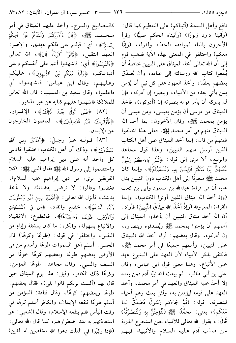 [83] قَوْلُهُ عَزَّ وَجَلَّ: {أَفَغَيْرَ دِينِ اللَّهِ يَبْغُونَ} [آل عمران: 83] وَذَلِكَ «أَنَّ أَهْلَ الْكِتَابِ اخْتَلَفُوا فَادَّعَى كُلُّ وَاحِدٍ أَنَّهُ عَلَى دِينِ إِبْرَاهِيمَ عَلَيْهِ السَّلَامُ وَاخْتَصَمُوا إِلَى رَسُولِ اللَّهِ صَلَّى اللَّهُ عَلَيْهِ وَسَلَّمَ فَقَالَ النَّبِيُّ صَلَّى اللَّهُ عَلَيْهِ وَسَلَّمَ: " كِلَا الْفَرِيقَيْنِ بَرِيءٌ مِنْ دِينِ إِبْرَاهِيمَ عَلَيْهِ السَّلَامُ "، فَغَضِبُوا وَقَالُوا: لَا نَرْضَى بِقَضَائِكَ وَلَا نَأْخُذُ بِدِينِكَ» ، فَأَنْزَلَ اللَّهُ تَعَالَى: {أَفَغَيْرَ دِينِ اللَّهِ يَبْغُونَ وَلَهُ أَسْلَمَ} [آل عمران: 83] خَضَعَ وَانْقَادَ، {مَنْ فِي السَّمَاوَاتِ وَالْأَرْضِ طَوْعًا وَكَرْهًا} [آلُ عِمْرَانَ: 83] فَالطَّوْعُ: الِانْقِيَادُ وَالِاتِّبَاعُ بِسُهُولَةٍ، وَالْكُرْهُ: مَا كَانَ بِمَشَقَّةٍ وَإِبَاءٍ مِنَ النَّفْسِ، وَاخْتَلَفُوا فِي قَوْلِهِ: (طَوْعًا وَكَرْهًا) قَالَ الْحَسَنُ: أَسْلَمَ أَهْلُ السموات طَوْعًا وَأَسْلَمَ مَنْ فِي الْأَرْضِ بَعْضُهُمْ طَوْعًا وَبَعْضُهُمْ كَرْهًا خَوْفًا مِنَ السَّيْفِ وَالسَّبْيِ، وَقَالَ مُجَاهِدٌ: طَوْعًا الْمُؤْمِنُ، وَكَرْهَا ذَلِكَ الْكَافِرُ، وَقِيلَ: هَذَا يَوْمُ الْمِيثَاقِ حِينَ قَالَ لَهُمْ {أَلَسْتُ بِرَبِّكُمْ قَالُوا بَلَى} [الْأَعْرَافِ: 172] فَقَالَ بَعْضُهُمْ: طَوْعًا وَبَعْضُهُمْ: كَرْهًا، وَقَالَ قَتَادَةُ: الْمُؤْمِنُ من أسلم طوعًا فنفعه الإيمان، وَالْكَافِرُ أَسْلَمَ كَرْهًا فِي وَقْتِ اليأس فلم ينفعه الإسلام، وَقَالَ الشَّعْبِيُّ: هُوَ اسْتِعَاذَتُهُمْ بِهِ عِنْدَ اضْطِرَارِهِمْ، كَمَا قَالَ اللَّهُ تَعَالَى: {فَإِذَا رَكِبُوا فِي الْفُلْكِ دَعَوُا اللَّهَ مُخْلِصِينَ لَهُ الدِّينَ} [الْعَنْكَبُوتِ: 65]