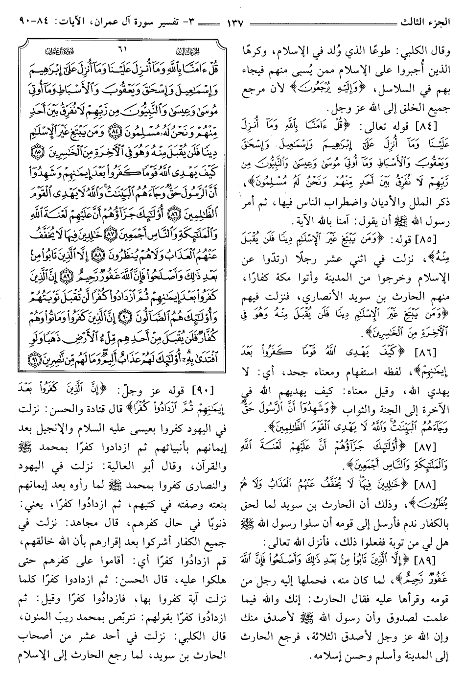 [85] قَوْلُهُ: {وَمَنْ يَبْتَغِ غَيْرَ الْإِسْلَامِ دِينًا فَلَنْ يُقْبَلَ مِنْهُ} [آلِ عمران: 85] نَزَلَتْ فِي اثْنَيْ عَشَرَ رَجُلًا ارْتَدُّوا عَنِ الْإِسْلَامِ وَخَرَجُوا مِنَ الْمَدِينَةِ وَأَتَوْا مَكَّةَ كُفَّارًا، مِنْهُمُ الْحَارِثُ بْنُ سُوَيْدٍ الْأَنْصَارِيُّ، فَنَزَلَتْ فِيهِمْ {وَمَنْ يَبْتَغِ غَيْرَ الْإِسْلَامِ دِينًا فَلَنْ يُقْبَلَ مِنْهُ وَهُوَ فِي الْآخِرَةِ مِنَ الْخَاسِرِينَ} [آل عمران: 85]