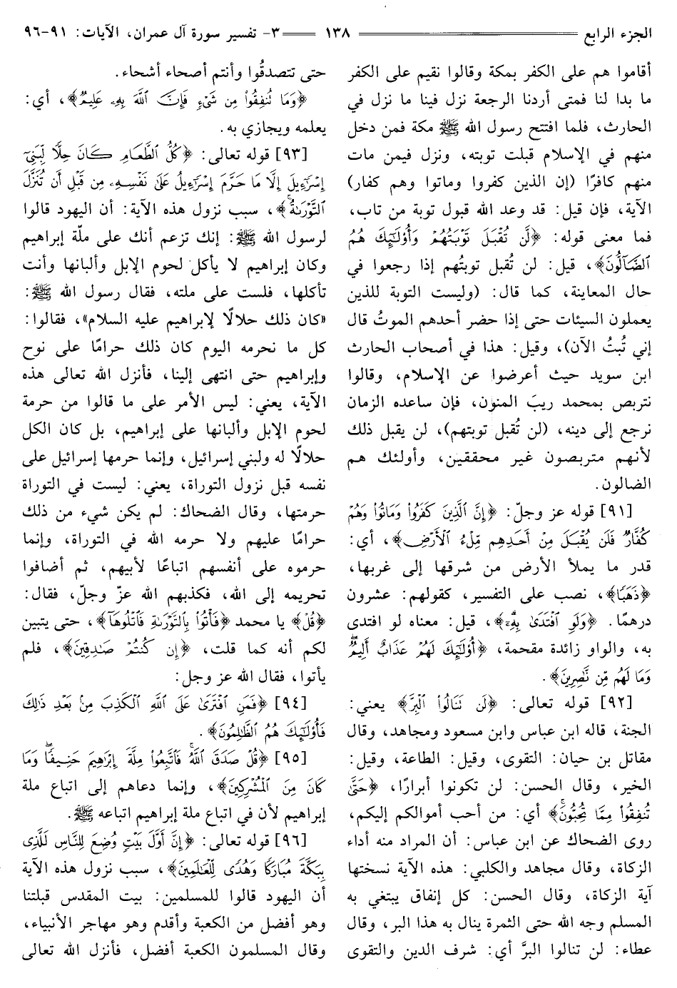[92] قَوْلُهُ تَعَالَى: {لَنْ تَنَالُوا الْبِرَّ} [آل عمران: 92] يَعْنِي: الْجَنَّةَ، قَالَهُ ابْنُ عَبَّاسٍ وَابْنُ مَسْعُودٍ وَمُجَاهِدٌ، وَقَالَ مُقَاتِلُ بْنُ حَيَّانَ: التَّقْوَى، وَقِيلَ: الطَّاعَةَ، وقيل: الخير، وقال الحسن: لن تكونوا أبرارا، {حَتَّى تُنْفِقُوا مِمَّا تُحِبُّونَ} [آل عمران: 92] أَيْ: مِنْ أَحَبِّ أَمْوَالِكُمْ إِلَيْكُمْ، رَوَى الضَّحَّاكُ عَنِ ابْنِ عَبَّاسٍ: أَنَّ الْمُرَادَ مِنْهُ أَدَاءُ الزَّكَاةِ، وَقَالَ مُجَاهِدٌ وَالْكَلْبِيُّ: هَذِهِ الْآيَةُ نَسَخَتْهَا آيَةُ الزَّكَاةِ، وَقَالَ الْحَسَنُ: كُلُّ إِنْفَاقٍ يَبْتَغِي بِهِ الْمُسْلِمُ وَجْهَ اللَّهِ حَتَّى الثَّمَرَةَ يَنَالُ بِهِ هَذَا الْبِرَّ، وَقَالَ عَطَاءٌ: لَنْ تَنَالُوا الْبِرَّ أَيْ: شَرَفَ الدِّينِ وَالتَّقْوَى حَتَّى تَتَصَدَّقُوا وَأَنْتُمْ أصحاء أشحاء. {وَمَا تُنْفِقُوا مِنْ شَيْءٍ فَإِنَّ اللَّهَ بِهِ عَلِيمٌ} [آل عمران: 92] أي: يعلمه ويجازي به.