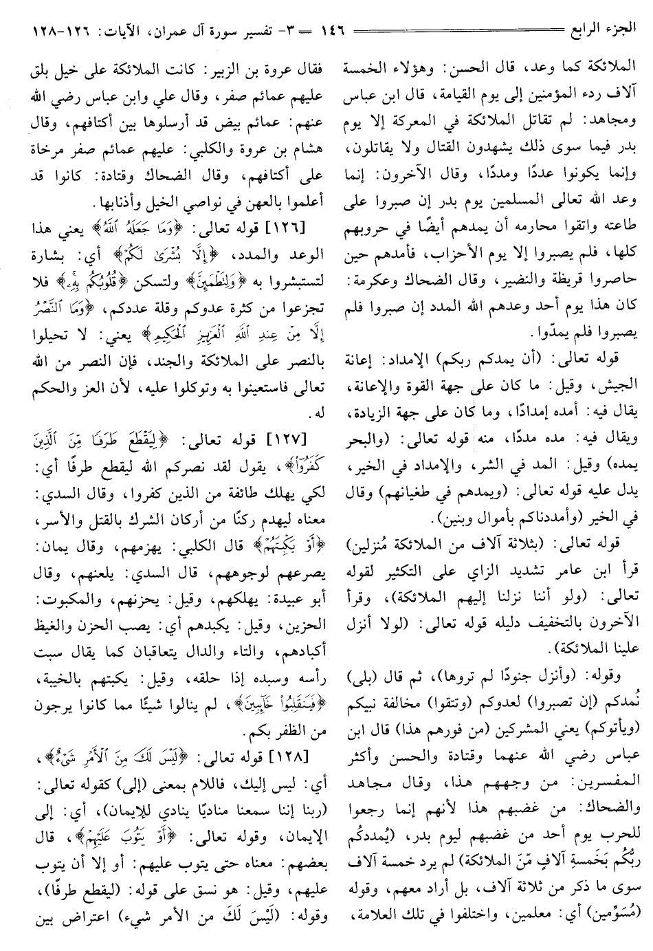 الملائكة كَمَا وَعَدَ، قَالَ الْحَسَنُ: وَهَؤُلَاءِ الْخَمْسَةُ آلَافٍ رِدْءُ الْمُؤْمِنِينَ إِلَى يَوْمِ الْقِيَامَةِ، قَالَ ابْنُ عَبَّاسٍ وَمُجَاهِدٌ: لَمْ تُقَاتِلِ الْمَلَائِكَةُ فِي المعركة إلا يوم بدر فيما سِوَى ذَلِكَ يَشْهَدُونَ الْقِتَالَ وَلَا يقاتلون، وإنما يكونون عددا ومددا، وَقَالَ الْآخَرُونَ: إِنَّمَا وَعَدَ اللَّهُ تَعَالَى الْمُسْلِمِينَ يَوْمَ بَدْرٍ إِنْ صَبَرُوا عَلَى طَاعَتِهِ وَاتَّقَوْا مَحَارِمَهُ أَنْ يَمُدَّهُمْ أَيْضًا فِي حُرُوبِهِمْ كلها، فلم يصبروا إلا يوم الأحزاب، فأمدهم حين حاصروا قريظة والنضير، وَقَالَ الضَّحَّاكُ وَعِكْرِمَةُ: كَانَ هَذَا يَوْمَ أُحُدٍ وَعَدَهُمُ اللَّهُ الْمَدَدَ إِنْ صَبَرُوا فَلَمْ يَصْبِرُوا فَلَمْ يمدوا. قَوْلُهُ تَعَالَى: {أَنْ يُمِدَّكُمْ رَبُّكُمْ} [آل عمران: 124] الإمداد: إعانة الجيش، وَقِيلَ: مَا كَانَ عَلَى جِهَةِ الْقُوَّةِ وَالْإِعَانَةِ، يُقَالُ فِيهِ: أُمِدُّهُ إِمْدَادًا، وَمَا كَانَ عَلَى جِهَةِ الزيادة، ويقال فيه: مده مددا، منه قَوْلُهُ تَعَالَى: {وَالْبَحْرُ يَمُدُّهُ} [لُقْمَانَ: 27] وَقِيلَ: الْمَدُّ فِي الشَّرِّ، وَالْإِمْدَادُ فِي الْخَيْرِ، يَدُلُّ عَلَيْهِ قَوْلُهُ تعالى: {وَيَمُدُّهُمْ فِي طُغْيَانِهِمْ} [البقرة: 15] وقال في الخير {وَأَمْدَدْنَاكُمْ بِأَمْوَالٍ وَبَنِينَ} [الْإِسْرَاءِ: 6] قَوْلُهُ تَعَالَى: {بِثَلَاثَةِ آلَافٍ مِنَ الْمَلَائِكَةِ مُنْزَلِينَ} [آل عمران: 124] قرأ ابن عامر تشديد الزَّايِ عَلَى التَّكْثِيرِ لِقَوْلِهِ تَعَالَى: {وَلَوْ أَنَّنَا نَزَّلْنَا إِلَيْهِمُ الْمَلَائِكَةَ} [الْأَنْعَامِ: 111] وَقَرَأَ الْآخَرُونَ بِالتَّخْفِيفِ دَلِيلُهُ قَوْلُهُ تَعَالَى: {لَوْلَا أُنْزِلَ عَلَيْنَا الْمَلَائِكَةُ} [الْفَرْقَانِ: 21] وَقَوْلُهُ: {وَأَنْزَلَ جُنُودًا لَمْ تَرَوْهَا} [التَّوْبَةِ: 26] ثُمَّ قَالَ {بَلَى} [آل عمران: 125] نمدكم {إِنْ تَصْبِرُوا} [آل عمران: 125] لعدوكم {وَتَتَّقُوا} [آل عمران: 125] مخالفة نبيكم {وَيَأْتُوكُمْ} [آل عمران: 125] يَعْنِي الْمُشْرِكِينَ {مِنْ فَوْرِهِمْ هَذَا} [آلِ عِمْرَانَ: 125] قَالَ ابْنُ عَبَّاسٍ رَضِيَ اللَّهُ عَنْهُمَا وَقَتَادَةُ وَالْحَسَنُ وَأَكْثَرُ الْمُفَسِّرِينَ: مِنْ وَجْهِهِمْ هَذَا، وَقَالَ مُجَاهِدٌ وَالضَّحَّاكُ: مِنْ غَضَبِهِمْ هَذَا لِأَنَّهُمْ إِنَّمَا رَجَعُوا لِلْحَرْبِ يَوْمَ أُحُدٍ مِنْ غَضَبِهِمْ لِيَوْمِ بَدْرٍ، {يُمْدِدْكُمْ رَبُّكُمْ بِخَمْسَةِ آلَافٍ مِنَ الْمَلَائِكَةِ} [آل عمران: 125] لَمْ يُرِدْ خَمْسَةَ آلَافٍ سِوَى مَا ذَكَرَ مِنْ ثَلَاثَةِ آلَافٍ، بَلْ أَرَادَ مَعَهُمْ، وَقَوْلُهُ {مُسَوِّمِينَ} [آل عمران: 125] أي: معلمين، وَاخْتَلَفُوا فِي تِلْكَ الْعَلَامَةِ، فَقَالَ عُرْوَةُ بْنُ الزُّبَيْرِ: كَانَتِ الْمَلَائِكَةُ عَلَى خَيْلٍ بُلْقٍ عَلَيْهِمْ عَمَائِمُ صُفْرٌ، وَقَالَ عَلِيٌّ وَابْنُ عَبَّاسٍ رضي الله عنهم: عَمَائِمُ بِيضٌ قَدْ أَرْسَلُوهَا بَيْنَ أَكْتَافِهِمْ، وَقَالَ هِشَامُ بْنُ عُرْوَةَ والكلبي: عليهم عَمَائِمُ صُفْرٌ مُرَخَّاةٌ عَلَى أَكْتَافِهِمْ، وَقَالَ الضَّحَّاكُ وَقَتَادَةُ: كَانُوا قَدْ أَعْلَمُوا بِالْعِهْنِ فِي نَوَاصِي الْخَيْلِ وأذنابها.