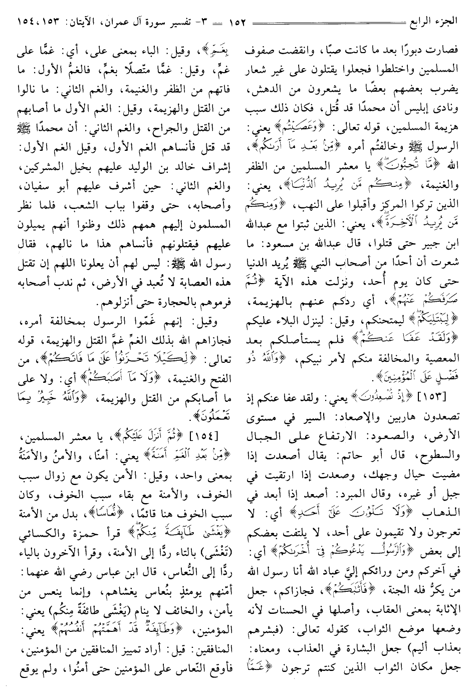 [153] {إِذْ تُصْعِدُونَ} [آل عمران: 153] يَعْنِي: وَلَقَدْ عَفَا عَنْكُمْ إِذْ تصعدون هاربين وَالْإِصْعَادُ: السَّيْرُ فِي مُسْتَوَى الْأَرْضِ، وَالصُّعُودُ: الِارْتِفَاعُ عَلَى الْجِبَالِ وَالسُّطُوحِ، قَالَ أَبُو حَاتِمٍ: يُقَالُ أَصْعَدْتَ إِذَا مَضَيْتَ حِيَالَ وَجْهِكَ، وَصَعِدْتَ إِذَا ارْتَقَيْتَ فِي جَبَلٍ أَوْ غَيْرِهِ، وَقَالَ الْمُبَرِّدُ: أَصْعَدَ إِذَا أبعد في الذهاب {وَلَا تَلْوُونَ عَلَى أَحَدٍ} [آل عمران: 153] أَيْ: لَا تَعْرُجُونَ وَلَا تُقِيمُونَ على أحد، لا يَلْتَفِتُ بَعْضُكُمْ إِلَى بَعْضٍ {وَالرَّسُولُ يَدْعُوكُمْ فِي أُخْرَاكُمْ} [آل عمران: 153] أَيْ: فِي آخِرِكُمْ وَمِنْ وَرَائِكُمْ إلي عباد الله أنا رَسُولُ اللَّهِ مَنْ يَكِرُّ فَلَهُ الجنة، {فَأَثَابَكُمْ} [آل عمران: 153] فَجَازَاكُمْ، جَعَلَ الْإِثَابَةَ بِمَعْنَى الْعِقَابِ، وَأَصْلُهَا فِي الْحَسَنَاتِ لِأَنَّهُ وَضَعَهَا مَوْضِعَ الثَّوَابِ، كَقَوْلِهِ تَعَالَى: {فَبَشِّرْهُمْ بِعَذَابٍ أَلِيمٍ} [آل عمران: 21] جَعَلَ الْبِشَارَةَ فِي الْعَذَابِ، وَمَعْنَاهُ: جعل مكان الثواب الذين كنتم ترجون {غَمًّا بِغَمٍّ} [آل عمران: 153] وَقِيلَ: الْبَاءُ بِمَعْنَى عَلَى، أَيْ: غَمًّا عَلَى غَمٍّ، وَقِيلَ: غَمَّا مُتَّصِلًا بِغَمٍّ، فَالْغَمُّ الْأَوَّلُ: مَا فَاتَهُمْ مِنَ الظَّفَرِ وَالْغَنِيمَةِ، وَالْغَمُّ الثاني: ما نالوا مِنَ الْقَتْلِ وَالْهَزِيمَةِ، وَقِيلَ: الْغَمُّ الْأَوَّلُ مَا أَصَابَهُمْ مِنَ الْقَتْلِ والجراح، والغم الثاني: أَنَّ مُحَمَّدًا صَلَّى اللَّهُ عَلَيْهِ وَسَلَّمَ قَدْ قُتِلَ فَأَنْسَاهُمُ الْغَمَّ الْأَوَّلَ، وَقِيلَ الْغَمُّ الْأَوَّلُ: إِشْرَافُ خَالِدِ بْنِ الْوَلِيدِ عَلَيْهِمْ بِخَيْلِ الْمُشْرِكِينَ، وَالْغَمُّ الثَّانِي: حِينَ أَشْرَفَ عليهم أَبُو سُفْيَانَ، وَأَصْحَابُهُ، حَتَّى وَقَفُوا بِبَابِ الشِّعْبِ، فَلَمَّا نَظَرَ الْمُسْلِمُونَ إليهم همهم ذَلِكَ وَظَنُّوا أَنَّهُمْ يَمِيلُونَ عَلَيْهِمْ فَيَقْتُلُونَهُمْ فَأَنْسَاهُمْ هَذَا مَا نَالَهُمْ، فَقَالَ رَسُولُ اللَّهِ صَلَّى اللَّهُ عَلَيْهِ وَسَلَّمَ: «لَيْسَ لَهُمْ أَنْ يَعْلُونَا اللَّهُمَّ إِنْ تَقْتُلْ هَذِهِ الْعِصَابَةَ لَا تُعْبَدُ فِي الْأَرْضِ» ، ثُمَّ نَدَبَ أَصْحَابَهُ فَرَمَوْهُمْ بِالْحِجَارَةِ حَتَّى أَنْزَلُوهُمْ. وَقِيلَ: إِنَّهُمْ غَمُّوا الرَّسُولَ بِمُخَالَفَةِ أَمْرِهِ، فَجَازَاهُمُ اللَّهُ بِذَلِكَ الْغَمَّ غَمَّ الْقَتْلِ وَالْهَزِيمَةِ، قَوْلُهُ تَعَالَى: {لِكَيْلَا تَحْزَنُوا عَلَى مَا فَاتَكُمْ} [آل عمران: 153] مِنَ الْفَتْحِ وَالْغَنِيمَةِ، {وَلَا مَا أَصَابَكُمْ} [آل عمران: 153] أَيْ: وَلَا عَلَى مَا أَصَابَكُمْ مِنَ الْقَتْلِ وَالْهَزِيمَةِ، {وَاللَّهُ خَبِيرٌ بِمَا تَعْمَلُونَ} [آل عمران: 153]