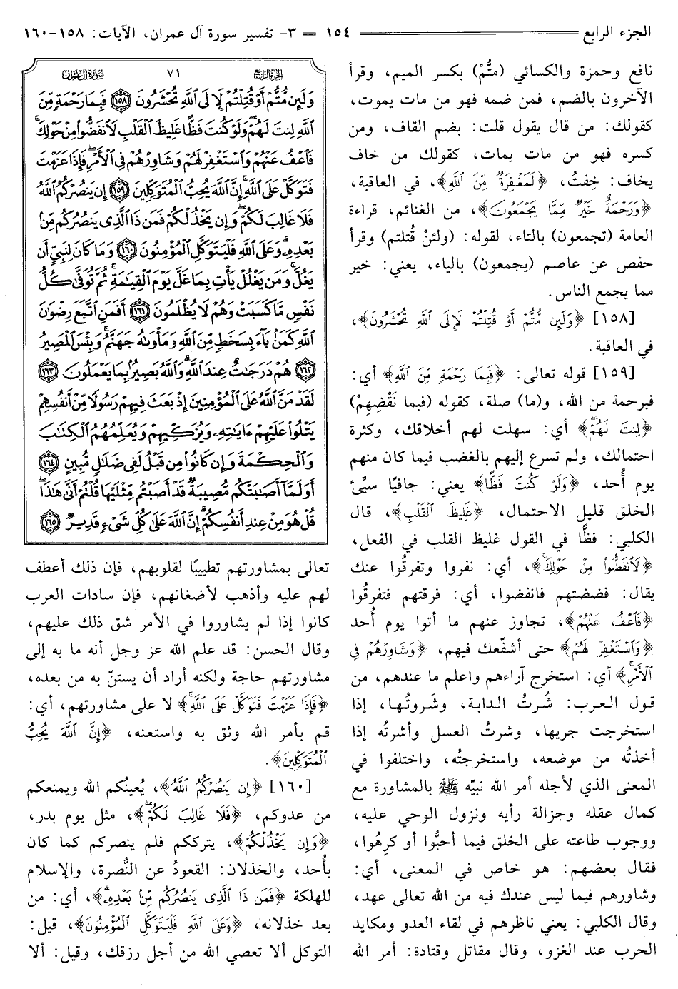 [159] قَوْلُهُ تَعَالَى: {فَبِمَا رَحْمَةٍ مِنَ اللَّهِ} [آلِ عِمْرَانَ: 159] أَيْ: فَبِرَحْمَةٍ مِنَ اللَّهِ، وَ (مَا) صِلَةٌ، كَقَوْلِهِ (فَبِمَا نَقْضِهِمْ) {لِنْتَ لَهُمْ} [آل عمران: 159] أَيْ: سَهُلَتْ لَهُمْ أَخْلَاقُكَ، وَكَثْرَةُ احتمالك، ولم تسرع إليهم بالغضب فِيمَا كَانَ مِنْهُمْ يَوْمَ أُحُدٍ، {وَلَوْ كُنْتَ فَظًّا} [آل عمران: 159] يَعْنِي: جَافِيًا سَيِّئَ الْخُلُقِ قَلِيلَ الاحتمال، {غَلِيظَ الْقَلْبِ} [آل عمران: 159] قَالَ الْكَلْبِيُّ: فَظًّا فِي الْقَوْلِ غَلِيظَ الْقَلْبِ فِي الْفِعْلِ، {لَانْفَضُّوا مِنْ حَوْلِكَ} [آل عمران: 159] أي: نفروا وَتَفَرَّقُوا عَنْكَ يُقَالُ: فَضَضْتُهُمُ فَانْفَضُّوا، أَيْ: فَرَّقْتُهُمْ فَتَفَرَّقُوا {فَاعْفُ عَنْهُمْ} [آل عمران: 159] تَجَاوَزْ عَنْهُمْ مَا أَتَوْا يَوْمَ أحد عاله {وَاسْتَغْفِرْ لَهُمْ} [آل عمران: 159] حَتَّى أُشَفِّعَكَ فِيهِمْ، {وَشَاوِرْهُمْ فِي الْأَمْرِ} [آل عمران: 159] أَيِ: اسْتَخْرِجْ آرَاءَهُمْ وَاعْلَمْ مَا عِنْدَهُمْ، مِنْ قَوْلِ الْعَرَبِ: شُرْتُ الدابة، وشروتها، إِذَا اسْتَخْرَجْتُ جَرْيَهَا، وَشُرْتُ الْعَسَلَ وَأَشَرْتُهُ إِذَا أَخَذْتُهُ مِنْ مَوْضِعِهِ، وَاسْتَخْرَجْتُهُ، وَاخْتَلَفُوا فِي الْمَعْنَى الَّذِي لأجله أمر الله نبيه و! سه بِالْمُشَاوَرَةِ مَعَ كَمَالِ عَقْلِهِ وَجَزَالَةِ رَأْيِهِ وَنُزُولِ الْوَحْيِ عَلَيْهِ، وَوُجُوبِ طَاعَتِهِ عَلَى الْخَلْقِ فِيمَا أَحَبُّوا أو كرهوا، فَقَالَ بَعْضُهُمْ: هُوَ خَاصٌّ فِي المعنى، أي: وشاورهم فيما لبس عِنْدَكَ فِيهِ مِنَ اللَّهِ تَعَالَى عهد، وقال الْكَلْبِيُّ: يَعْنِي نَاظِرْهُمْ فِي لِقَاءِ الْعَدُوِّ وَمَكَايِدِ الْحَرْبِ عِنْدَ الْغَزْوِ، وَقَالَ مُقَاتِلٌ وَقَتَادَةُ: أَمَرَ اللَّهُ تَعَالَى بِمُشَاوَرَتِهِمْ تَطْيِيبًا لِقُلُوبِهِمْ، فَإِنَّ ذَلِكَ أَعْطَفُ لَهُمْ عَلَيْهِ وَأَذْهَبُ لِأَضْغَانِهِمْ، فَإِنَّ سَادَاتِ الْعَرَبِ كَانُوا إِذَا لَمْ يُشَاوَرُوا فِي الْأَمْرِ شَقَّ ذَلِكَ عَلَيْهِمْ، وَقَالَ الْحَسَنُ: قَدْ عَلِمَ اللَّهُ عَزَّ وَجَلَّ أَنَّهُ مَا بِهِ إِلَى مُشَاوَرَتِهِمْ حَاجَةٌ وَلَكِنَّهُ أَرَادَ أَنْ يَسْتَنَّ به من بعده، {فَإِذَا عَزَمْتَ فَتَوَكَّلْ عَلَى اللَّهِ} [آل عمران: 159] لَا عَلَى مُشَاوَرَتِهِمْ، أَيْ: قُمْ بِأَمْرِ اللَّهِ وَثِقْ بِهِ وَاسْتَعِنْهُ، {إِنَّ اللَّهَ يُحِبُّ الْمُتَوَكِّلِينَ} [آل عمران: 159]