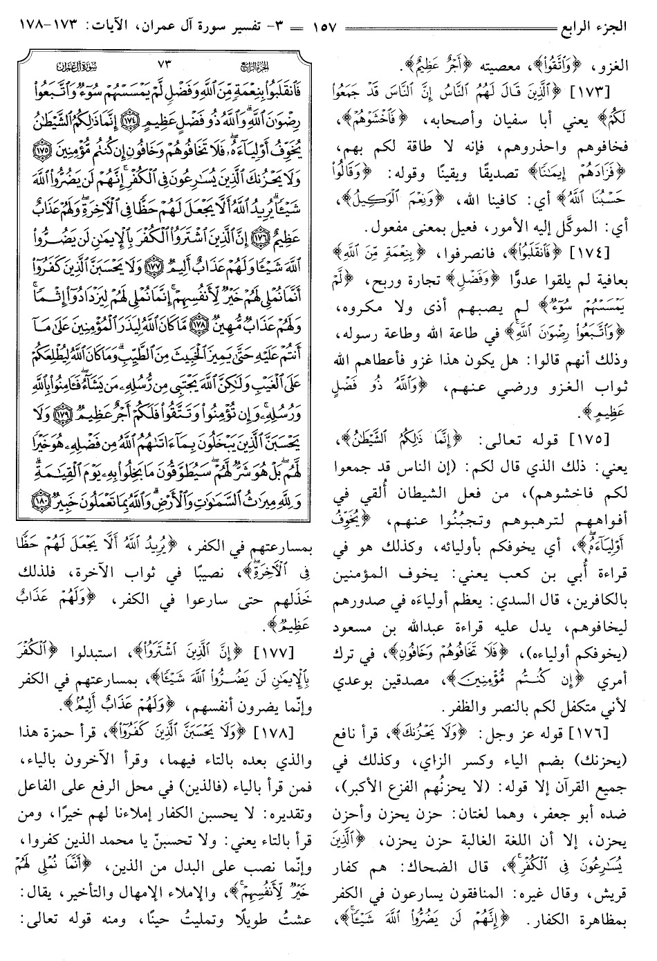 [176] قَوْلُهُ عَزَّ وَجَلَّ: {وَلَا يَحْزُنْكَ} [آل عمران: 176] قَرَأَ نَافِعٌ (يُحْزِنُكَ) بِضَمِّ الْيَاءِ وكسر الزاي، وكذلك في جَمِيعُ الْقُرْآنِ إِلَّا قَوْلَهُ: {لَا يَحْزُنُهُمُ الْفَزَعُ الْأَكْبَرُ} [الأنبياء: 103] ضِدَّهُ أَبُو جَعْفَرٍ، وَهُمَا لُغَتَانِ: حَزِنَ يَحْزُنُ وَأَحْزَنَ يُحْزِنُ، إِلَّا أَنَّ اللُّغَةَ الْغَالِبَةَ حَزِنَ يَحْزُنُ، {الَّذِينَ يُسَارِعُونَ فِي الْكُفْرِ} [آل عمران: 176] قَالَ الضَّحَّاكُ: هُمْ كُفَّارُ قُرَيْشٍ، وقال غيره: الْمُنَافِقُونَ يُسَارِعُونَ فِي الْكُفْرِ بِمُظَاهَرَةِ الْكُفَّارِ. {إِنَّهُمْ لَنْ يَضُرُّوا اللَّهَ شَيْئًا} [آل عمران: 176] بِمُسَارَعَتِهِمْ فِي الْكُفْرِ، {يُرِيدُ اللَّهُ أَلَّا يَجْعَلَ لَهُمْ حَظًّا فِي الْآخِرَةِ} [آل عمران: 176] نَصِيبًا فِي ثَوَابِ الْآخِرَةِ، فَلِذَلِكَ خَذَلَهُمْ حَتَّى سَارَعُوا فِي الْكُفْرِ، {وَلَهُمْ عَذَابٌ عَظِيمٌ} [آل عمران: 176]