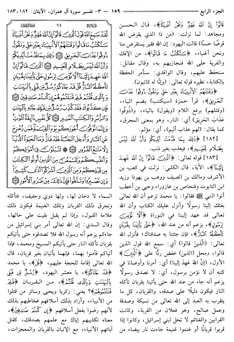 [183] قَوْلُهُ تَعَالَى: {الَّذِينَ قَالُوا إِنَّ اللَّهَ عَهِدَ إِلَيْنَا} [آل عمران: 183] الْآيَةَ، قَالَ الْكَلْبِيُّ: نَزَلَتْ فِي كَعْبِ بْنِ الْأَشْرَفِ وَمَالِكِ بْنِ الصَّيْفِ وَوَهْبِ بْنِ يَهُوذَا وَزَيْدِ بْنِ التَّابُوتِ وَفِنْحَاصَ بْنِ عَازُورَاءَ وَحُيَيِّ بْنِ أَخْطَبَ أَتَوُا النَّبِيَّ صَلَّى اللَّهُ عَلَيْهِ وَسَلَّمَ فَقَالُوا: يَا مُحَمَّدُ تَزْعُمُ أَنَّ اللَّهَ تَعَالَى بَعَثَكَ إِلَيْنَا رَسُولًا وَأَنْزَلَ عَلَيْكَ الْكِتَابَ وَأَنَّ اللَّهَ تَعَالَى قَدْ عَهِدَ إِلَيْنَا فِي التَّوْرَاةِ {أَلَّا نُؤْمِنَ لِرَسُولٍ} [آل عمران: 183] يزعم أنه مِنْ عِنْدِ اللَّهِ، {حَتَّى يَأْتِيَنَا بِقُرْبَانٍ تَأْكُلُهُ النَّارُ} [آل عمران: 183] فإن جئتنا به صدقناك؟ فَأَنْزَلَ اللَّهُ تَعَالَى: (الَّذِينَ قَالُوا) أَيْ: سَمِعَ اللَّهُ قَوْلَ الَّذِينَ قَالُوا، وَمَحَلُّ (الَّذِينَ) خَفْضٌ رَدًّا عَلَى الَّذِينَ الْأَوَّلِ، (إِنَّ اللَّهَ عَهِدَ إِلَيْنَا) أَيْ: أَمَرَنَا وَأَوْصَانَا فِي كُتُبِهِ أَنْ لَا نُؤْمِنُ بِرَسُولٍ، أَيْ: لَا نُصَدِّقَ رَسُولًا يَزْعُمُ أَنَّهُ جَاءَ مِنْ عِنْدِ اللَّهِ حَتَّى يَأْتِيَنَا بِقُرْبَانٍ تَأْكُلُهُ النار أضار فَيَكُونُ دَلِيلًا عَلَى صِدْقِهِ، وَالْقُرْبَانُ، كُلُّ مَا يَتَقَرَّبُ بِهِ الْعَبْدُ إِلَى اللَّهِ تَعَالَى مِنْ نَسِيكَةٍ وصدقة ملأ وعمل صالح، وهو فُعْلَانٌ مِنَ الْقُرْبَةِ، وَكَانَتِ الْقَرَابِينُ وَالْغَنَائِمُ لَا تَحِلُّ لِبَنِي إِسْرَائِيلَ، وَكَانُوا إِذَا قَرَّبُوا قُرْبَانًا أَوْ غَنِمُوا غَنِيمَةً جَاءَتْ نَارٌ بَيْضَاءُ مِنَ السَّمَاءِ لَا دُخَانَ لَهَا، وَلَهَا دَوِيٌّ وَحَفِيفٌ، فَتَأْكُلُهُ وَتُحْرِقُ ذَلِكَ الْقُرْبَانَ وَتِلْكَ الْغَنِيمَةَ فَيَكُونُ ذَلِكَ عَلَامَةَ الْقَبُولِ، وَإِذَا لَمْ يُقْبَلْ بَقِيَتْ عَلَى حَالِهَا، وَقَالَ السُّدِّيُّ: إِنَّ اللَّهَ تَعَالَى أَمَرَ بَنِي إِسْرَائِيلَ مَنْ جَاءَكُمْ يَزْعُمُ أَنَّهُ رَسُولُ اللَّهِ فَلَا تُصَدِّقُوهُ حَتَّى يَأْتِيَكُمْ بِقُرْبَانٍ تَأْكُلُهُ النَّارُ حَتَّى يَأْتِيَكُمُ الْمَسِيحُ وَمُحَمَّدٌ، فَإِذَا أَتَيَاكُمْ فَآمِنُوا بِهِمَا، فَإِنَّهُمَا يَأْتِيَانِ بِغَيْرِ قُرْبَانٍ، قَالَ اللَّهُ تَعَالَى إقامة للحجة عليهم، {قُلْ} [آل عمران: 183] يا محمد {قَدْ جَاءَكُمْ} [آل عمران: 183] يَا مَعْشَرَ الْيَهُودِ، {رُسُلٌ مِنْ قَبْلِي بِالْبَيِّنَاتِ وَبِالَّذِي قُلْتُمْ} [آل عمران: 183] من القربان {فَلِمَ قَتَلْتُمُوهُمْ} [آل عمران: 183] ؟ يَعْنِي: زَكَرِيَّا وَيَحْيَى وَسَائِرَ مَنْ قَتَلُوا مِنَ الْأَنْبِيَاءِ، وَأَرَادَ بِذَلِكَ أَسْلَافَهُمْ فَخَاطَبَهُمْ بِذَلِكَ لِأَنَّهُمْ رَضُوا بِفِعْلِ أَسْلَافِهِمْ {إِنْ كُنْتُمْ صَادِقِينَ} [آل عمران: 183] معناه تكذيبهم إياك مَعَ عِلْمِهِمْ بِصِدْقِكَ، كَقَتْلِ آبَائِهِمُ الْأَنْبِيَاءَ، مَعَ الْإِتْيَانِ بِالْقُرْبَانِ وَالْمُعْجِزَاتِ،