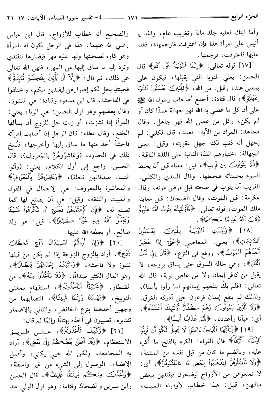 [19] {يَا أَيُّهَا الَّذِينَ آمَنُوا لَا يَحِلُّ لَكُمْ أَنْ تَرِثُوا النِّسَاءَ كَرْهًا} [النساء: 19] قَالَ الْفَرَّاءُ: الْكَرْهُ بِالْفَتْحِ مَا أُكْرِهُ عَلَيْهِ، وَبِالضَّمِّ مَا كَانَ مِنْ قِبَلِ نَفْسِهِ مِنَ الْمَشَقَّةِ، {وَلَا تَعْضُلُوهُنَّ لِتَذْهَبُوا بِبَعْضِ مَا آتَيْتُمُوهُنَّ} [النساء: 19] أَيْ: لَا تَمْنَعُوهُنَّ مِنَ الْأَزْوَاجِ ليضجرن فيفتدين ببعض مالهن قِيلَ: هَذَا خِطَابٌ لِأَوْلِيَاءِ الْمَيِّتِ، وَالصَّحِيحُ أَنَّهُ خِطَابٌ لِلْأَزْوَاجِ، قَالَ ابْنِ عَبَّاسٍ رَضِيَ اللَّهُ عَنْهُمَا. هَذَا فِي الرَّجُلِ تَكُونُ لَهُ الْمَرْأَةُ وَهُوَ كَارِهٌ لِصُحْبَتِهَا وَلَهَا عَلَيْهِ مَهْرٌ فَيُضَارُّهَا لِتَفْتَدِيَ وَتَرُدَّ إِلَيْهِ مَا سَاقَ إِلَيْهَا مِنَ الْمَهْرِ، فَنَهَى اللَّهُ تَعَالَى عَنْ ذَلِكَ، ثُمَّ قَالَ: {إِلَّا أَنْ يَأْتِينَ بِفَاحِشَةٍ مُبَيِّنَةٍ} [النساء: 19] فَحِينَئِذٍ يَحِلُّ لَكُمْ إِضْرَارُهَنَّ لِيَفْتَدِينَ مِنْكُمْ، وَاخْتَلَفُوا فِي الْفَاحِشَةِ، قَالَ ابْنُ مَسْعُودٍ وَقَتَادَةُ: هِيَ النُّشُوزُ، وَقَالَ بَعْضُهُمْ وَهُوَ قَوْلُ الْحَسَنِ: هِيَ الزِّنَا، يَعْنِي: الْمَرْأَةُ إِذَا نَشَزَتْ، أَوْ زَنَتْ حَلَّ لِلزَّوْجِ أَنْ يَسْأَلَهَا الْخُلْعَ، وَقَالَ عَطَاءٌ: كَانَ الرَّجُلُ إِذَا أَصَابَتِ امْرَأَتُهُ فَاحِشَةً أَخَذَ مِنْهَا مَا سَاقَ إليها وأخرجها، فنسخ ذلك في الحدود، (وَعَاشِرُوهُنَّ بِالْمَعْرُوفِ) ، قال الحسن: راجع إِلَى أَوَّلِ الْكَلَامِ، يَعْنِي: {وَآتُوا النِّسَاءَ صَدُقَاتِهِنَّ نِحْلَةً} [النساء: 4] {وَعَاشِرُوهُنَّ بِالْمَعْرُوفِ} [النساء: 19] وَالْمُعَاشَرَةُ بِالْمَعْرُوفِ: هِيَ الْإِجْمَالُ فِي القول والمبيت والنفقة، وقيل: هي أن يصنع لها كما تصنع لَهُ، {فَإِنْ كَرِهْتُمُوهُنَّ فَعَسَى أَنْ تَكْرَهُوا شَيْئًا وَيَجْعَلَ اللَّهُ فِيهِ خَيْرًا كَثِيرًا} [النساء: 19] قِيلَ: هُوَ وَلَدٌ صَالِحٌ، أَوْ يعطفه الله عليها.