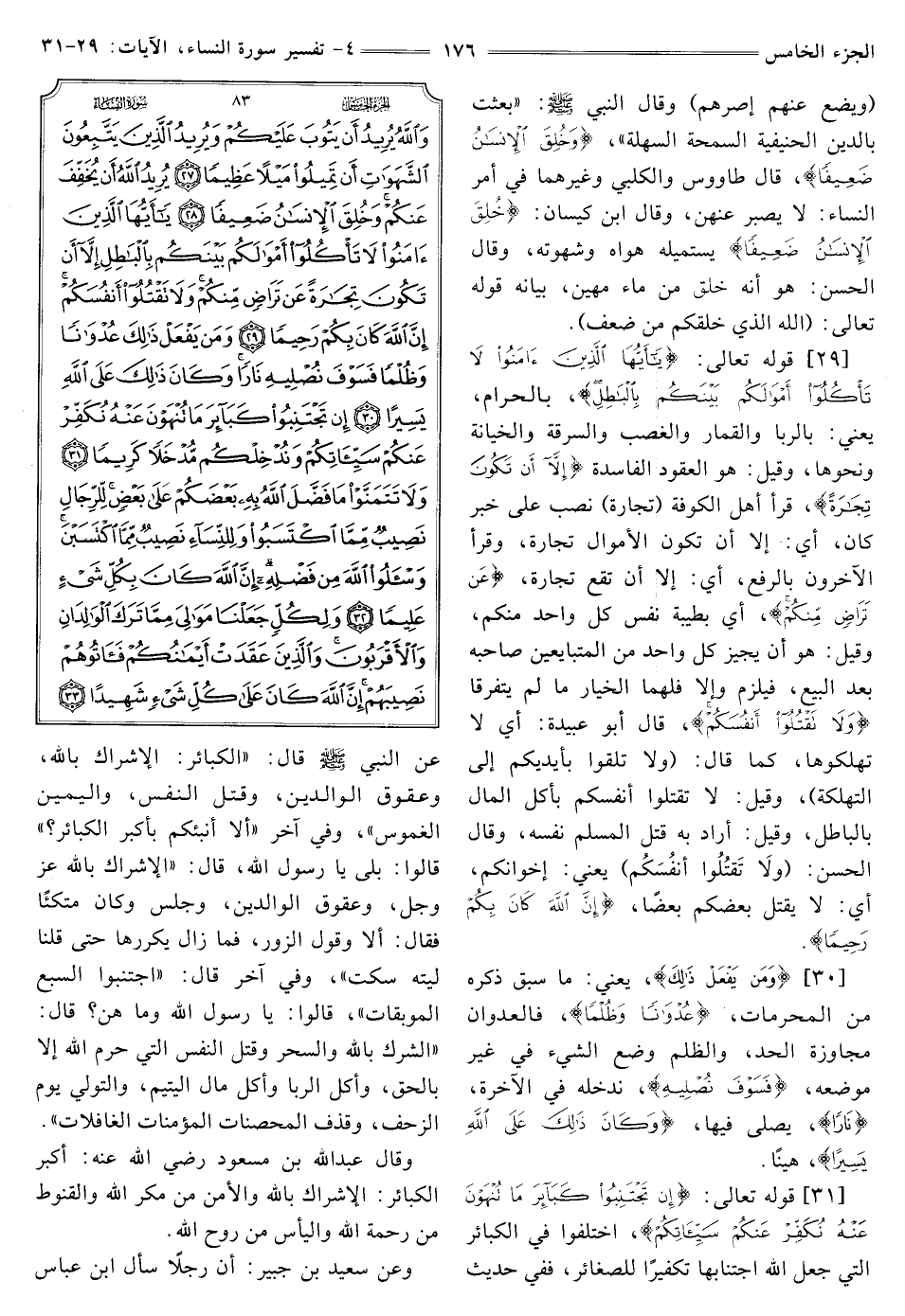 [29] ، قَوْلُهُ تَعَالَى: {يَا أَيُّهَا الَّذِينَ آمَنُوا لَا تَأْكُلُوا أَمْوَالَكُمْ بَيْنَكُمْ بِالْبَاطِلِ} [النساء: 29] بِالْحَرَامِ، يَعْنِي: بِالرِّبَا وَالْقُمَارِ وَالْغَصْبِ وَالسَّرِقَةِ وَالْخِيَانَةِ وَنَحْوَهَا، وَقِيلَ: هُوَ الْعُقُودُ الْفَاسِدَةُ {إِلَّا أَنْ تَكُونَ تِجَارَةً} [النساء: 29] قَرَأَ أَهْلُ الْكُوفَةِ (تِجَارَةً) نُصِبَ عَلَى خَبَرِ كَانَ، أَيْ: إِلَّا أَنْ تَكُونَ الْأَمْوَالُ تِجَارَةً، وَقَرَأَ الْآخَرُونَ بِالرَّفْعِ، أَيْ: إِلَّا أَنْ تَقَعَ تِجَارَةٌ {عَنْ تَرَاضٍ مِنْكُمْ} [النساء: 29] أَيْ بِطِيبَةِ نَفْسِ كُلِّ وَاحِدٍ مِنْكُمْ، وَقِيلَ: هُوَ أَنْ يُجِيزَ كُلُّ وَاحِدٍ مِنَ الْمُتَبَايِعَيْنِ صَاحِبَهُ بَعْدَ الْبَيْعِ، فَيَلْزَمُ وَإِلَّا فَلَهُمَا الخيار ما لم لتفرقا {وَلَا تَقْتُلُوا أَنْفُسَكُمْ} [النساء: 29] قَالَ أَبُو عُبَيْدَةَ: أَيْ لَا تُهْلِكُوهَا، كَمَا قَالَ: {وَلَا تُلْقُوا بِأَيْدِيكُمْ إِلَى التَّهْلُكَةِ} [الْبَقَرَةِ: 195] وَقِيلَ: لَا تَقْتُلُوا أَنْفُسَكُمْ بِأَكْلِ الْمَالِ بِالْبَاطِلِ، وَقِيلَ: أَرَادَ بِهِ قَتْلَ المسلم نفسه، وَقَالَ الْحَسَنُ: (وَلَا تَقْتُلُوا أَنْفُسَكُمْ) يَعْنِي: إِخْوَانَكُمْ، أَيْ: لَا يَقْتُلُ بَعْضُكُمْ بَعْضًا، {إِنَّ اللَّهَ كَانَ بِكُمْ رَحِيمًا} [النساء: 29]