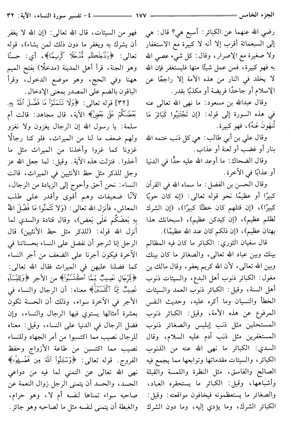 [32] ، قَوْلُهُ تَعَالَى: {وَلَا تَتَمَنَّوْا مَا فَضَّلَ اللَّهُ بِهِ بَعْضَكُمْ عَلَى بَعْضٍ} [النساء: 32] الْآيَةَ، قَالَ مُجَاهِدٌ: قَالَتْ أُمُّ سَلَمَةَ: يَا رَسُولَ اللَّهِ إِنَّ الرِّجَالَ يَغْزُونَ وَلَا نَغْزُو وَلَهُمْ ضِعْفُ مَا لَنَا مِنَ الْمِيرَاثِ، فَلَوْ كُنَّا رِجَالًا غَزَوْنَا كَمَا غَزَوْا وَأَخَذْنَا مِنَ الْمِيرَاثِ مِثْلَ مَا أَخَذُوا. فَنَزَلَتْ هَذِهِ الْآيَةُ. وَقِيلَ: لَمَّا جَعَلَ اللَّهُ عَزَّ وَجَلَّ لِلذَّكَرِ مِثْلَ حَظِّ الْأُنْثَيَيْنِ فِي الْمِيرَاثِ، قَالَتِ النِّسَاءُ: نَحْنُ أَحَقُّ وَأَحْوَجُ إِلَى الزِّيَادَةِ مِنَ الرجال، لأنا ضعيفات وَهُمْ أَقْوَى وَأَقْدَرُ عَلَى طَلَبِ الْمَعَاشِ، فَأَنْزَلَ اللَّهُ تَعَالَى: (وَلَا تَتَمَنَّوْا مَا فَضَّلَ اللَّهُ بِهِ بَعْضَكُمْ عَلَى بَعْضٍ) ، وَقَالَ قَتَادَةُ والسدي لما أنزل الله قَوْلُهُ: {لِلذَّكَرِ مِثْلُ حَظِّ الْأُنْثَيَيْنِ} [النساء: 11] قال الرجل إِنَّا لِنَرْجُوَ أَنْ نُفَضَّلَ عَلَى النِّسَاءِ بِحَسَنَاتِنَا فِي الْآخِرَةِ فَيَكُونُ أَجْرُنَا عَلَى الضِّعْفِ مِنْ أَجْرِ النِّسَاءِ كَمَا فُضِّلْنَا عَلَيْهِنَّ فِي الْمِيرَاثِ فَقَالَ اللَّهُ تَعَالَى: {لِلرِّجَالِ نَصِيبٌ مِمَّا اكْتَسَبُوا} [النساء: 32] مِنَ الْأَجْرِ {وَلِلنِّسَاءِ نَصِيبٌ مِمَّا اكْتَسَبْنَ} [النساء: 32] مَعْنَاهُ: أَنَّ الرِّجَالَ وَالنِّسَاءَ فِي الْأَجْرِ فِي الْآخِرَةِ سَوَاءٌ، وَذَلِكَ أن الحسنة تكون بعشرة أَمْثَالِهَا يَسْتَوِي فِيهَا الرِّجَالُ وَالنِّسَاءُ، وَإِنْ فُضِّلَ الرِّجَالُ فِي الدُّنْيَا عَلَى النِّسَاءِ، وَقِيلَ: مَعْنَاهُ لِلرِّجَالِ نَصِيبٌ مِمَّا اكْتَسَبُوا مِنْ أَمْرِ الْجِهَادِ وَلِلنِّسَاءِ نَصِيبٌ مِمَّا اكْتَسَبْنَ مِنْ طَاعَةِ الْأَزْوَاجِ وَحِفْظِ الْفُرُوجِ. قَوْلُهُ تَعَالَى: {وَاسْأَلُوا اللَّهَ مِنْ فَضْلِهِ} [النساء: 32] نهى اللَّهُ تَعَالَى عَنِ التَّمَنِّي لِمَا فِيهِ مِنْ دَوَاعِي الْحَسَدِ، وَالْحَسَدُ أن يتمنى الرجل زوال النعمة عن صاحبه سواء تمناها لنفسه أم لا، وَهُوَ حَرَامٌ، وَالْغِبْطَةُ أَنْ يَتَمَنَّى لِنَفْسِهِ مِثْلَ مَا لِصَاحِبِهِ وَهُوَ جَائِزٌ.