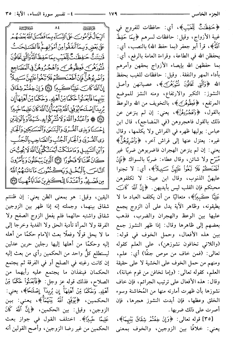 [35] ، قَوْلُهُ تَعَالَى: {وَإِنْ خِفْتُمْ شِقَاقَ بَيْنِهِمَا} [النساء: 35] يعني: خلافا بَيْنَ الزَّوْجَيْنِ، وَالْخَوْفُ بِمَعْنَى الْيَقِينِ، وَقِيلَ: هُوَ بِمَعْنَى الظَّنِّ يَعْنِي: إِنْ ظَنَنْتُمْ شِقَاقَ بَيْنِهِمَا، وَجُمْلَتُهُ أَنَّهُ إِذَا ظَهَرَ بَيْنَ الزَّوْجَيْنِ شِقَاقٌ وَاشْتَبَهَ حَالُهُمَا فَلَمْ يَفْعَلِ الزَّوْجُ الصَّفْحَ وَلَا الْفُرْقَةَ وَلَا الْمَرْأَةُ تَأْدِيَةَ الْحَقِّ وَلَا الْفِدْيَةَ وَخَرَجَا إِلَى مَا لَا يَحِلُّ قَوْلًا وَفِعْلًا بَعَثَ الْإِمَامُ حَكَمًا مِنْ أَهْلِهِ إِلَيْهِ وَحَكَمًا مَنْ أَهْلِهَا إِلَيْهَا رَجُلَيْنِ حُرَّيْنِ عَدْلَيْنِ لِيَسْتَطْلِعَ كُلُّ وَاحِدٍ مِنَ الْحَكَمَيْنِ رَأْيَ مَنْ بُعِثَ إِلَيْهِ إِنْ كانت رغبته في الصلح أَوْ فِي الْفُرْقَةِ ثُمَّ يَجْتَمِعُ الْحَكَمَانِ فَيُنْفِذَانِ مَا يَجْتَمِعُ عَلَيْهِ رَأْيُهُمَا مِنَ الصَّلَاحِ، فَذَلِكَ قَوْلُهُ عَزَّ وَجَلَّ: {فَابْعَثُوا حَكَمًا مِنْ أَهْلِهِ وَحَكَمًا مِنْ أَهْلِهَا إِنْ يُرِيدَا إِصْلَاحًا} [النساء: 35] يَعْنِي: الْحَكَمَيْنِ، {يُوَفِّقِ اللَّهُ بَيْنَهُمَا} [النساء: 35] يَعْنِي: بَيْنَ الزَّوْجَيْنِ، وَقِيلَ: بَيْنَ الْحَكَمَيْنِ، {إِنَّ اللَّهَ كَانَ عَلِيمًا خَبِيرًا} [النساء: 35] اختلف الْقَوْلُ فِي جَوَازِ بَعْثِ الْحَكَمَيْنِ مِنْ غَيْرِ رِضَا الزَّوْجَيْنِ، وَأَصَحُّ الْقَوْلَيْنِ أَنَّهُ
