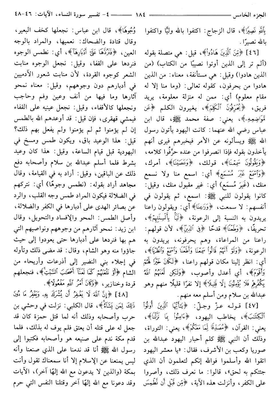 [47] ، قَوْلُهُ عَزَّ وَجَلَّ: {يَا أَيُّهَا الَّذِينَ أُوتُوا الْكِتَابَ} [النساء: 47] يُخَاطِبُ الْيَهُودَ، {آمِنُوا بِمَا نَزَّلْنَا} [النساء: 47] يَعْنِي: الْقُرْآنَ، {مُصَدِّقًا لِمَا مَعَكُمْ} [النساء: 47] يَعْنِي: التَّوْرَاةَ، وَذَلِكَ أَنَّ النَّبِيَّ صَلَّى اللَّهُ عَلَيْهِ وَسَلَّمَ كَلَّمَ أَحْبَارَ الْيَهُودِ عَبْدَ اللَّهِ بْنَ صُورِيَّا وَكَعْبَ بْنَ الْأَشْرَفِ، فَقَالَ: «يَا مَعْشَرَ الْيَهُودِ اتَّقُوا اللَّهَ وَأَسْلِمُوا فَوَاللَّهِ إِنَّكُمْ لِتَعْلَمُونِ أَنَّ الَّذِي جِئْتُكُمْ بِهِ لَحَقٌّ» ، قَالُوا: مَا نَعْرِفُ ذَلِكَ، وَأَصَرُّوا عَلَى الكفر، وأنزلت هَذِهِ الْآيَةُ، {مِنْ قَبْلِ أَنْ نَطْمِسَ وُجُوهًا} [النساء: 47] قَالَ ابْنُ عَبَّاسٍ: نَجْعَلُهَا كَخُفِّ الْبَعِيرِ، وَقَالَ قَتَادَةُ وَالضَّحَّاكُ: نُعْمِيهَا، وَالْمُرَادُ بِالْوَجْهِ الْعَيْنُ، {فَنَرُدَّهَا عَلَى أَدْبَارِهَا} [النساء: 47] أي: نطمس الوجوه فنردها عَلَى الْقَفَا، وَقِيلَ: نَجْعَلُ الْوُجُوهَ مَنَابِتَ الشَّعْرِ كَوُجُوهِ الْقِرَدَةِ، لِأَنَّ مَنَابِتَ شُعُورِ الْآدَمِيِّينَ فِي أَدْبَارِهِمْ دُونَ وُجُوهِهِمْ، وَقِيلَ: مَعْنَاهُ نَمْحُو آثَارَهَا وَمَا فِيهَا مِنْ أَنْفٍ وعين وفم وحاجب ونجعلها كَالْأَقْفَاءِ. وَقِيلَ: نَجْعَلُ عَيْنَيْهِ عَلَى القفاء فيمشي قهقرى، فإن قيل: قد أوعدهم الله بِالطَّمْسِ إِنْ لَمْ يُؤْمِنُوا ثُمَّ لَمْ يُؤْمِنُوا وَلَمْ يَفْعَلْ بِهِمْ ذَلِكَ؟ قِيلَ: هَذَا الْوَعِيدُ بَاقٍ، ويكون طمس ومسخ في اليهودية قبل قيام الساعة، وقيل: هذا كان وعيد بِشَرْطٍ فَلَمَّا أَسْلَمَ عَبْدُ اللَّهِ بْنُ سَلَامٍ وَأَصْحَابُهُ دَفَعَ ذَلِكَ عَنِ الْبَاقِينَ، وَقِيلَ: أَرَادَ بِهِ في الْقِيَامَةَ، وَقَالَ مُجَاهِدٌ أَرَادَ بِقَوْلِهِ: (نَطْمِسَ وُجُوهًا) أَيْ: نَتْرُكَهُمْ فِي الضَّلَالَةِ فَيَكُونُ الْمُرَادُ طَمْسَ وَجْهِ الْقَلْبِ، وَالرَّدَّ عَنْ بَصَائِرِ الْهُدَى عَلَى أَدْبَارِهَا فِي الْكُفْرِ وَالضَّلَالَةِ، وَأَصْلُ الطَّمْسِ: الْمَحْوُ وَالْإِفْسَادُ وَالتَّحْوِيلُ، وَقَالَ ابْنُ زَيْدٍ: نَمْحُو آثَارَهُمْ من وجوههم ونواصيهم الَّتِي هُمْ بِهَا فَنَرُدُّهَا عَلَى أدبارها حتى يعودوا إلى حيث جاؤوا منه وَهُوَ الشَّامُ، وَقَالَ: قَدْ مَضَى ذَلِكَ وَتَأَوَّلَهُ فِي إِجْلَاءِ بَنِي النَّضِيرِ إِلَى أَذَرُعَاتٍ وَأَرْيِحَاءَ مِنَ الشَّامِ {أَوْ نَلْعَنَهُمْ كَمَا لَعَنَّا أَصْحَابَ السَّبْتِ} [النساء: 47] فَنَجْعَلَهُمْ قِرَدَةً وَخَنَازِيرَ {وَكَانَ أَمْرُ اللَّهِ مَفْعُولًا} [النساء: 47]
