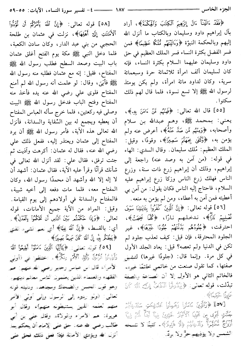 [58] قَوْلُهُ تَعَالَى: {إِنَّ اللَّهَ يَأْمُرُكُمْ أَنْ تُؤَدُّوا الْأَمَانَاتِ إِلَى أَهْلِهَا} [النَّسَاءِ: 58] نَزَلَتْ فِي عُثْمَانَ بْنُ طَلْحَةَ الْحَجَبِيِّ مِنْ بَنِي عَبْدِ الدَّارِ، وَكَانَ سَادِنَ الْكَعْبَةِ، فَلَمَّا دَخَلَ النَّبِيُّ صَلَّى اللَّهُ عَلَيْهِ وَسَلَّمَ مَكَّةَ يَوْمَ الْفَتْحِ أَغْلَقَ عُثْمَانُ بَابَ الْبَيْتِ وَصَعَدَ السَّطْحَ فَطَلَبَ رَسُولِ اللَّهِ صَلَّى اللَّهُ عَلَيْهِ وَسَلَّمَ الْمِفْتَاحَ، فَقِيلَ: إِنَّهُ مَعَ عُثْمَانَ فَطَلَبَهُ مِنْهُ رَسُولُ اللَّهِ صَلَّى اللَّهُ عَلَيْهِ وَسَلَّمَ، وَقَالَ: لَوْ عَلِمْتُ أَنَّهُ رَسُولُ اللَّهِ لم أمنع الْمِفْتَاحُ فَلَوَى عَلِيُّ رَضِيَ اللَّهُ عَنْهُ يَدَهُ فَأَخَذَ مِنْهُ الْمِفْتَاحَ وَفَتَحَ الْبَابَ فَدَخَلَ رَسُولُ اللَّهِ صَلَّى اللَّهُ عَلَيْهِ وَسَلَّمَ الْبَيْتَ وَصَلَّى فِيهِ رَكْعَتَيْنِ، فَلَمَّا خَرَجَ سَأَلَهُ الْعَبَّاسُ الْمِفْتَاحَ أَنَّ يُعْطِيَهُ وَيَجْمَعَ لَهُ بَيْنَ السِّقَايَةِ وَالسِّدَانَةِ، فَأَنْزَلَ اللَّهُ تَعَالَى هَذِهِ الْآيَةَ، فَأَمَرَ رَسُولُ اللَّهِ صَلَّى اللَّهُ عَلَيْهِ وَسَلَّمَ أَنْ يَرُدَّ الْمِفْتَاحَ إِلَى عُثْمَانَ وَيَعْتَذِرَ إِلَيْهِ، فَفَعَلَ ذَلِكَ عَلِيٌّ رَضِيَ اللَّهُ عَنْهُ، فَقَالَ لَهُ عُثْمَانُ: أَكْرَهْتَ وَآذَيْتَ ثُمَّ جِئْتَ تَرْفُقَ، فَقَالَ عَلِيٌّ: لَقَدْ أَنْزَلَ اللَّهُ تَعَالَى فِي شَأْنِكَ قُرْآنًا وَقَرَأَ عَلَيْهِ الْآيَةَ، فَقَالَ عُثْمَانِ: أَشْهَدُ أَنْ لَا إِلَهَ إِلَّا اللَّهُ وَأَشْهَدُ أَنَّ مُحَمَّدًا رَسُولُ اللَّهِ، وَكَانَ الْمِفْتَاحُ مَعَهُ، فَلَمَّا مَاتَ دَفَعَهُ إِلَى أَخِيهِ شَيْبَةَ، فَالْمِفْتَاحُ وَالسِّدَانَةُ فِي أَوْلَادِهِمْ إِلَى يَوْمِ الْقِيَامَةِ. وَقِيلَ: الْمُرَادُ مِنَ الْآيَةِ جَمِيعَ الْأَمَانَاتِ، قَوْلُهُ تَعَالَى: {وَإِذَا حَكَمْتُمْ بَيْنَ النَّاسِ أَنْ تَحْكُمُوا بِالْعَدْلِ} [النساء: 58] أَيْ: بِالْقِسْطِ، {إِنَّ اللَّهَ نِعِمَّا} [النساء: 58] أَيْ نِعْمَ الشَّيْءُ الَّذِي {يَعِظُكُمْ بِهِ إِنَّ اللَّهَ كَانَ سَمِيعًا بَصِيرًا} [النساء: 58]